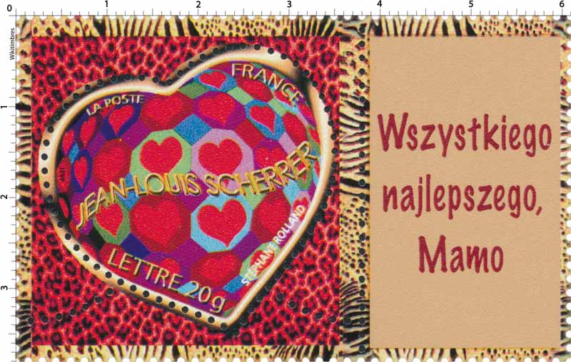 Timbre : JEAN-LOUIS SCHERRER Mesures Format d'imp 32 x 30 mm Dents incluses 61 x 38 mm Forme horizontal Phosphore Non Impression héliogravure Complément xxxxx Couleur polychrome Valeur sans valeur faciale Dentelure Cœur Emis en feuille de 10 TP Quantité - Auteurs Dessinateur Stéphane Rolland pour Jean-Louis Scherrer Graveur xxxxx Mise en page Bruno Ghiringhelli Mentions Création de Stéphane Rolland pour Jean-Louis Scherrer Numéros & Dates N° Philatelix - N° Michel - Date d'émission 09/01/2006 Date de retrait 14/12/2007 Classements Groupe Personnalisé 2006 Scherrer - Bonne fête maman Catégorie TP et Vignettes personnalisées Familles Saint-Valentin timbre à message festivités Usage Lettre prioritaire 20g Régions - Départements - Description Saint Valentin Cœur 2006 Scherrer Wszystkiego najlepszego, Mamo Commentaire - Mes timbres & notes personnelles www.wikitimbres.fr