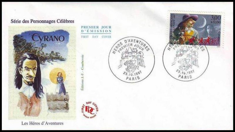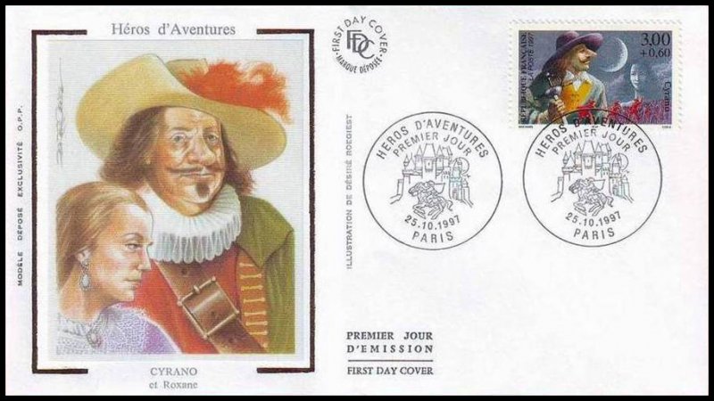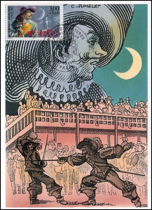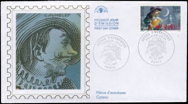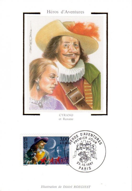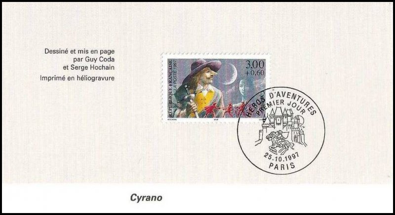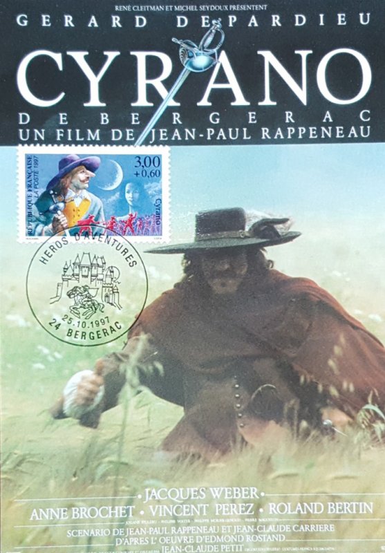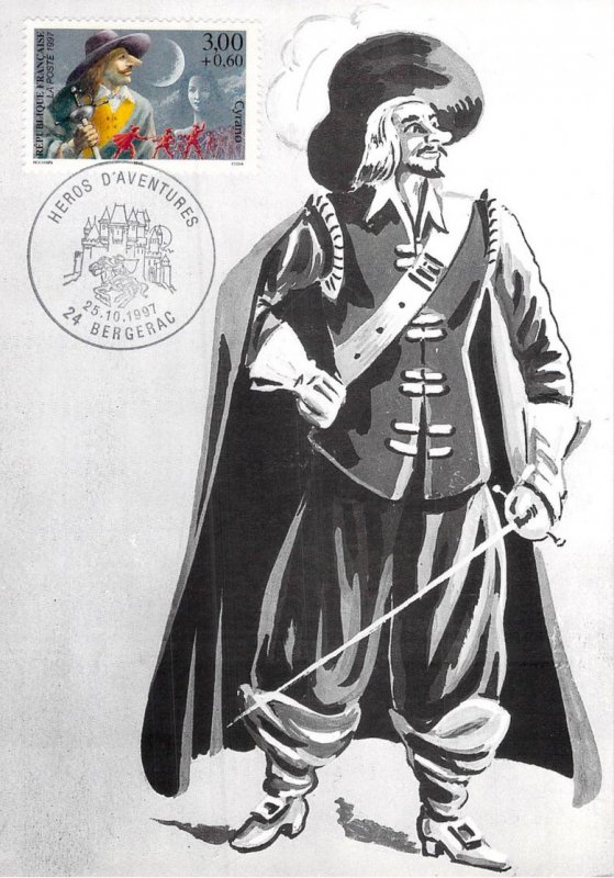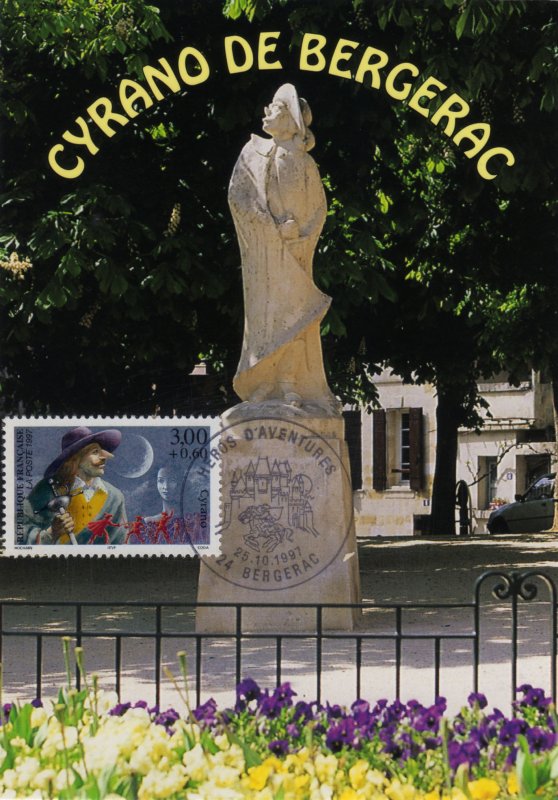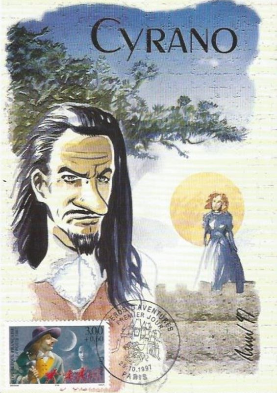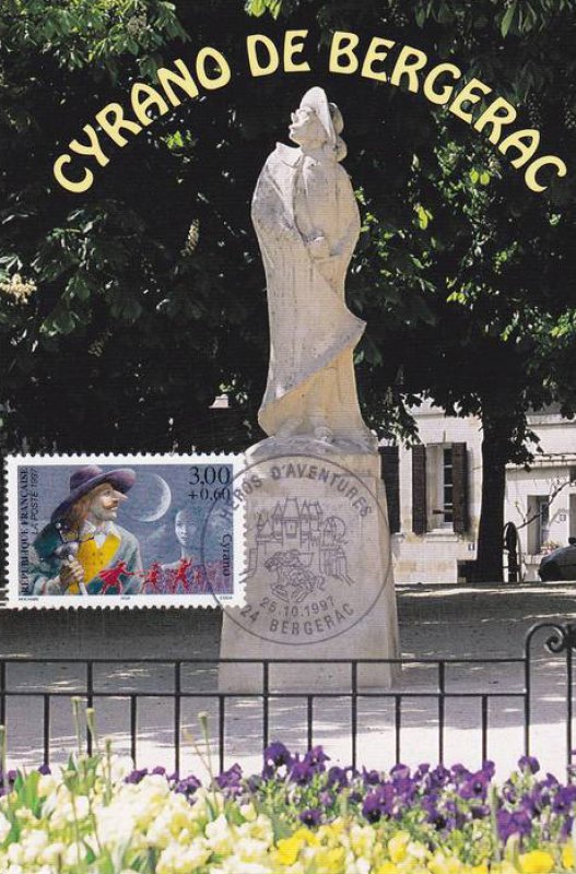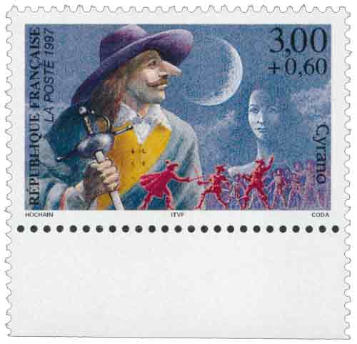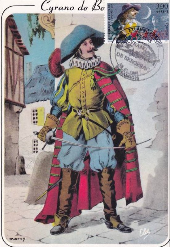 | Description | Savinien Cyrano de Bergerac, créé par Edmond Rostand (1868-1918), auteur dramatique, né à Marseille, qui s'inspire d'un personnage réel, Savinien Cyrano de Bergerac (1619-1655), provenant d'une feuille de 50 TP |