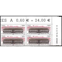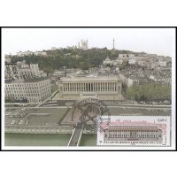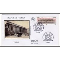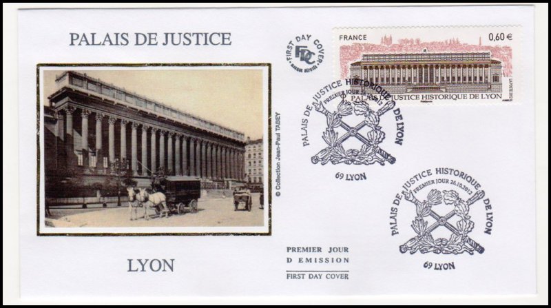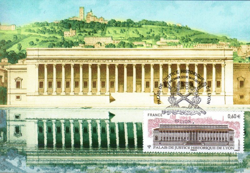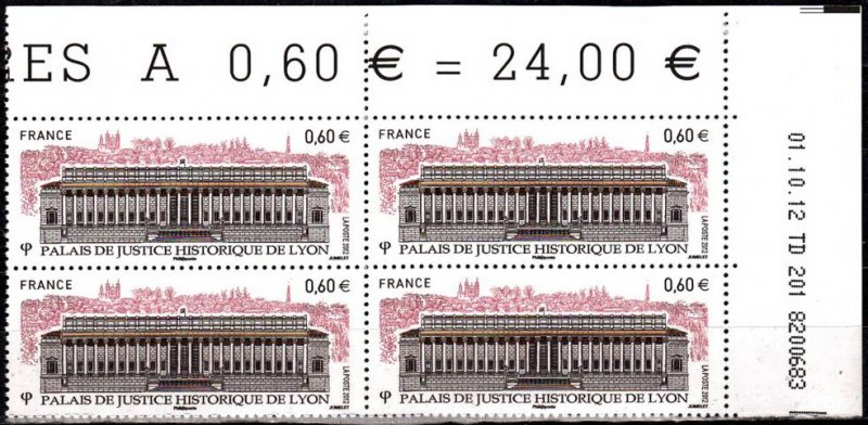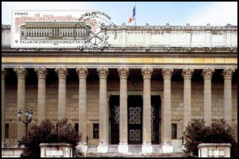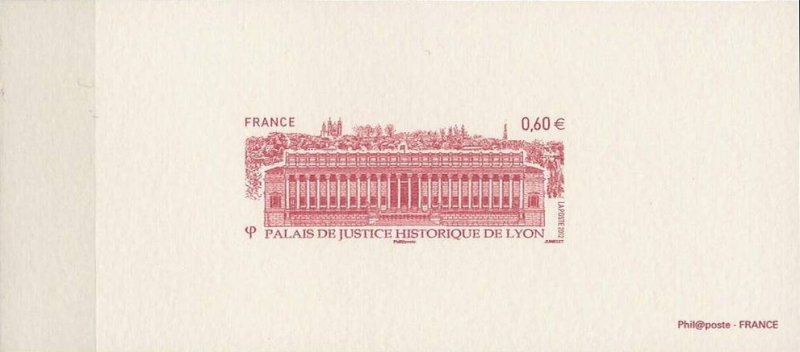 | Commentaire | Émis en planche de 10 bandes de 4 TP Le Palais de justice des Vingt-Quatre colonnes, construit en 1847 par Baltard, est intimement inscrit dans le paysage de Lyon et occupe une place privilégiée dans la mémoire collective de ses habitants. Son imposante façade classique où le style corinthien exprime son exubérance (85 m de longueur et 24 m de hauteur), est indissociable de la vision de la colline de Fourvière, dont elle semble constituer le robuste socle. L’extérieur, l’intérieur et le mobilier sont classés au patrimoine de L’Unesco. Une opération complète de réhabilitation de cet édifice a été menée depuis 2008. La Poste a décidé d’émettre un timbre pour la restauration de ce beau Palais en 2012.