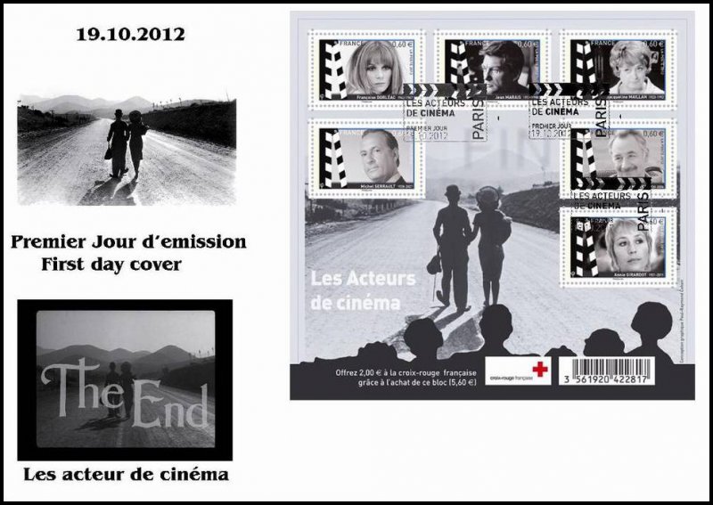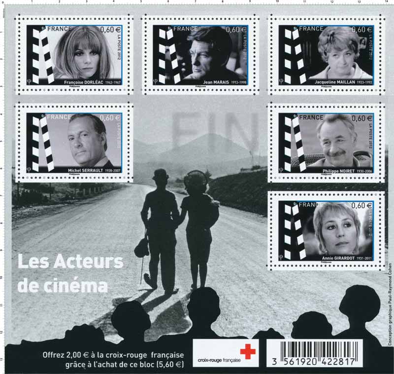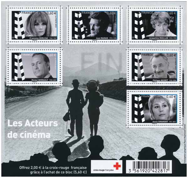 | Commentaire | 2,00 € de supplément sont attribués à la Croix-Rouge française Ce bloc-feuillet rend hommage a six monstres sacrés du 7eme art : Françoise Dorléac, Jean Marais, Jacqueline Maillan, Michel Serrault, Philippe Noiret et Annie Girardot, avec pour fond de bloc, la dernière image du film de Charlie Chaplin ≪ Les Temps Modernes ≫; il montre les deux héros, l’ouvrier Charlot et la gamine fugueuse Paulette Goddard, s’éloigner d’un même pas vers un avenir incertain mais partagé. |