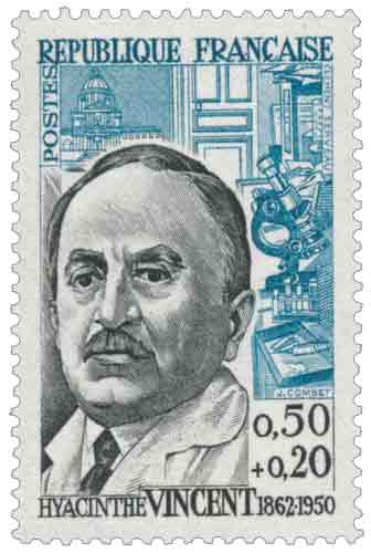 Émis en juin 1962 avec surtaxe au profit de la Croix-Rouge française, ce timbre commémoratif rend hommage à Hyacinthe Vincent, figure majeure de la médecine militaire et de la bactériologie françaises, dont l’œuvre scientifique s’inscrit dans le prolongement direct des avancées pasteuriennes en matière de médecine préventive. Né à Bordeaux en 1862, Vincent mena l’essentiel de sa carrière au sein du Service de santé militaire, où il développa des recherches décisives en bactériologie et en épidémiologie, domaines encore en pleine structuration à la fin du XIXᵉ siècle. Professeur au Val-de-Grâce puis au Collège de France, membre de l’Académie de médecine et de l’Académie des sciences, il acquit une renommée internationale par l’identification de l’infection fuso-spirillaire responsable de l’angine dite « de Vincent », mais surtout par la mise au point de vaccins antityphoïdiques utilisés à grande échelle pendant la Première Guerre mondiale, contribuant de façon déterminante à la protection sanitaire des troupes françaises. Ses travaux sur les sérums contre la gangrène gazeuse et certaines infections bactériennes majeures consolidèrent son rôle de pionnier de la médecine préventive moderne. Le timbre s’inscrit ainsi dans une série de 1962 consacrée aux grandes figures scientifiques et intellectuelles françaises, associant portrait solennel et références symboliques à son activité médicale, et rappelle l’importance stratégique de la recherche médicale dans l’histoire contemporaine, tout en liant cette reconnaissance nationale à une cause humanitaire par le biais de la surtaxe Croix-Rouge. |