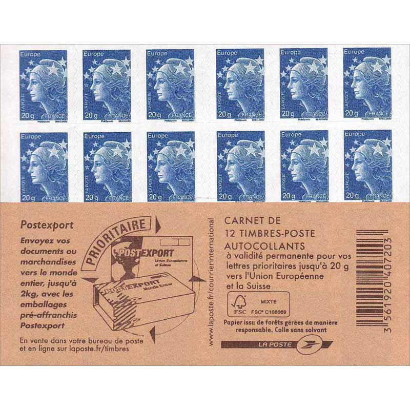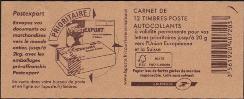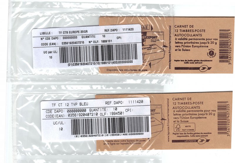 | Description | carnet de 12 TVP bleu avec le nouveau logo rectangulaire FSC Mixte sur la couverture |