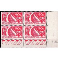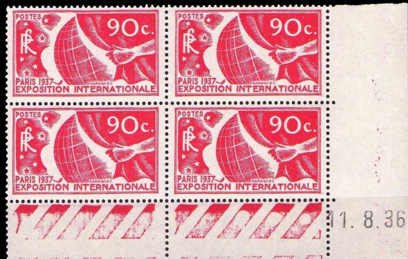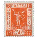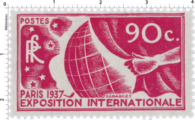 | Commentaire | Paris Exposition Internationale 1937 - Globe. Cette valeur de 90 centimes appartient à la série émise en septembre 1936 en amont de l’Exposition internationale des arts et des techniques dans la vie moderne, organisée à Paris en 1937. Elle s’inscrit dans une politique philatélique cohérente visant à accompagner un événement majeur destiné à affirmer le rôle culturel, artistique et technique de la France dans un contexte international tendu. Contrairement aux valeurs inférieures de la série, le dessin de ce timbre est confié à Jean-Gabriel Daragnès, figure importante de la gravure et de l’illustration françaises de l’entre-deux-guerres, tandis que la gravure reste assurée par Gabriel-Antoine Barlangue, garantissant une continuité stylistique et technique au sein de l’émission. Le motif reprend l’iconographie générale de la série, centrée sur un symbole d’annonce et de rayonnement, mais adopte ici un format horizontal, choix plus rare pour les émissions typographiques de l’époque et réservé aux valeurs destinées à des usages postaux spécifiques. La teinte rose-carmin, vive et soutenue, distingue clairement cette valeur au sein de la série et répond à une exigence de lisibilité pour le courrier international. En effet, la valeur faciale de 90 c correspond à l’affranchissement de la carte postale pour l’étranger, usage très répandu dans les échanges touristiques et culturels des années 1930, particulièrement dans le cadre d’une manifestation internationale attirant visiteurs et correspondances du monde entier. Imprimé en typographie, ce timbre se caractérise par un dessin ample et une mise en page équilibrée, renforcée par son grand format horizontal. Sa commercialisation, limitée à quelques mois entre septembre 1936 et février 1937, confirme son rôle d’émission strictement liée à l’événement. Aujourd’hui, cette valeur de 90 c constitue une pièce représentative de la série, appréciée tant pour sa fonction postale précise que pour la singularité de son format et l’intervention de Daragnès dans sa conception.