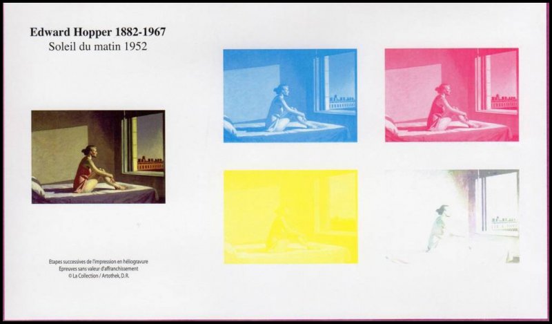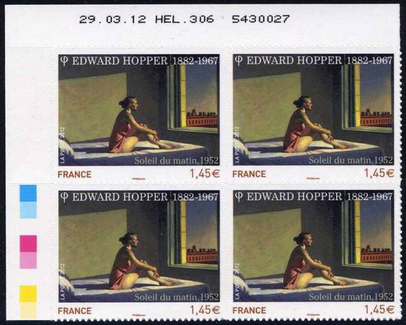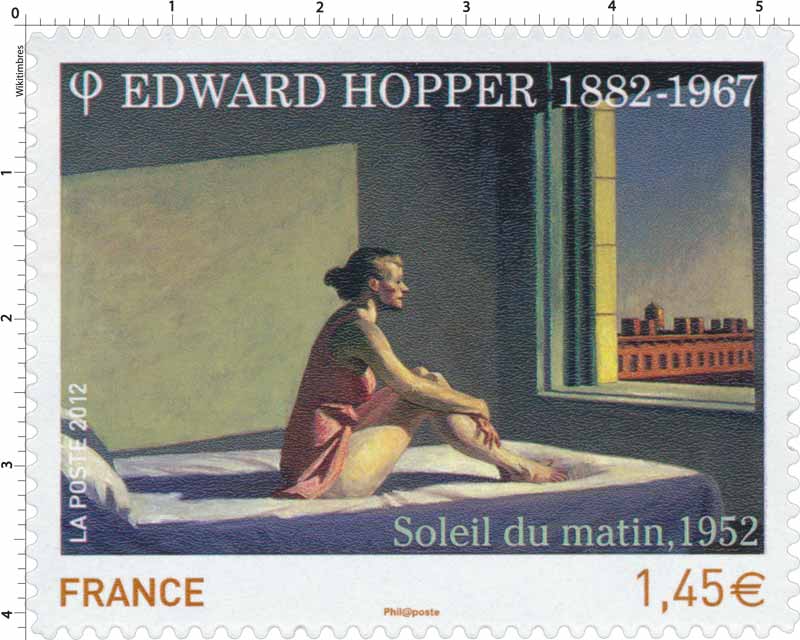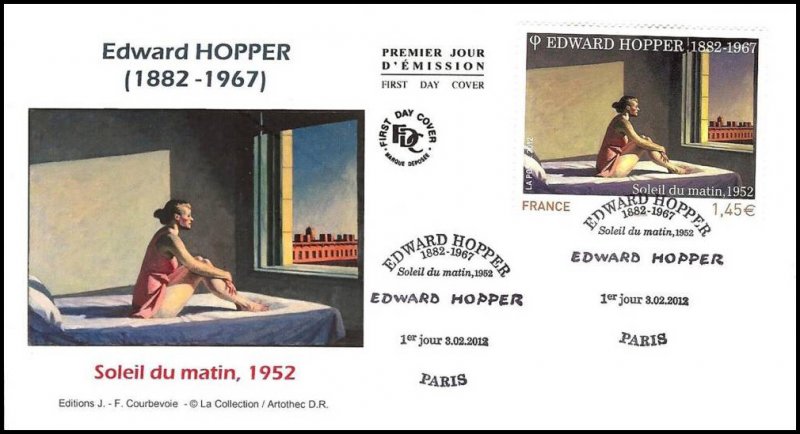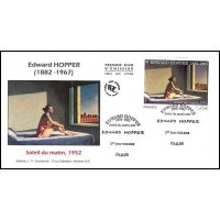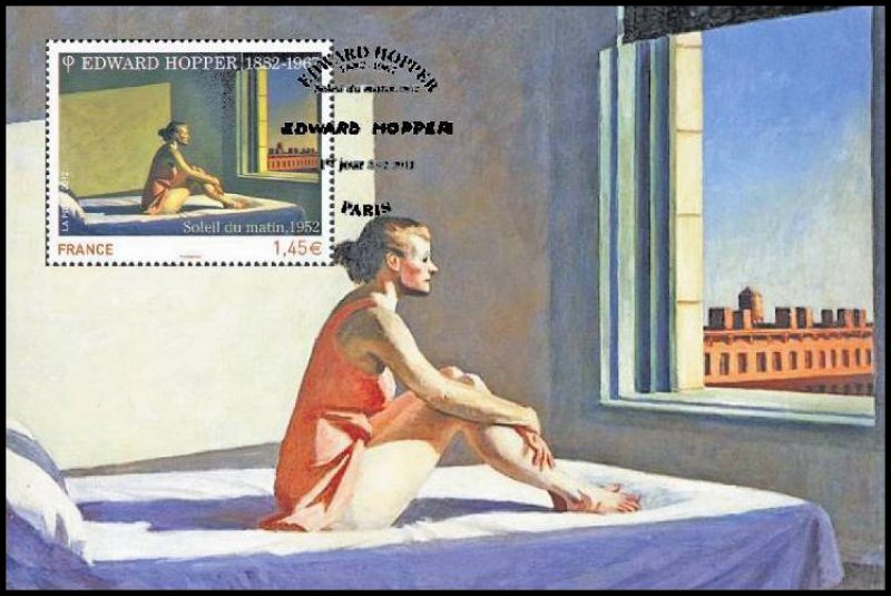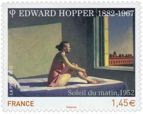 | Commentaire | Timbre à date “Premier Jour” conçu par Sarah Lazarevic Peintre et graveur américain, Edward Hopper exerça essentiellement son art à New York. Considéré comme l’un des représentants du naturalisme ou de la scène américaine, il peignait la vie quotidienne des classes moyennes. Il produisit de nombreuses huiles sur toile, mais également des gravures et des aquarelles. Une grande partie de l’oeuvre de Hopper exprime la nostalgie d’une Amérique du passé, ainsi que le conflit entre la nature et le monde moderne. Ses personnages sont le plus souvent esseulés et mélancoliques, à l’instar de cette jeune femme, sur la toile qui illustre le timbre Soleil du matin. |