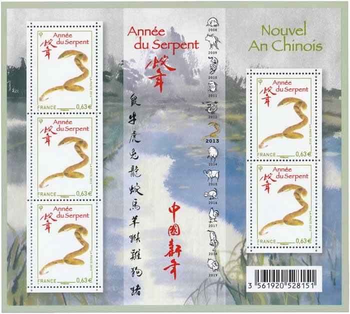 | Commentaire | Comme chaque année, La Poste fête le nouvel an chinois par le biais de l’émission d'un bloc de 5 timbres. 2013 est l'année du Serpent. Cette année encore, c’est Li Zhongyao qui a été choisi pour réaliser le bloc. En Chine, Li Zhongyao est diplômé de la faculté des Beaux-Arts de l’Institut supérieur de Nankin et en France, d’un DEA d’arts plastiques. Il enseigne et peint depuis trente ans. Ses spécialités sont la calligraphie, les paysages, les fleurs, les animaux et en particulier les oiseaux. Le calendrier chinois actuel est à quelques détails près celui qui fut instauré plus de cent ans avant notre ère par l’empereur Wudi, de la dynastie Han. D'autres calendriers préexistants faisaient débuter l’année à des dates différentes. Chaque année décline les douze signes du zodiaque chinois, associés aux 12 rameaux terrestres du cycle sexagésimal, qui se succèdent dans un ordre cyclique : rat, buffle, tigre, lapin, dragon, serpent, cheval, chèvre, singe, coq, chien, cochon. L’année est également associée à un des cinq éléments fondamentaux : métal, eau, bois, feu, terre.