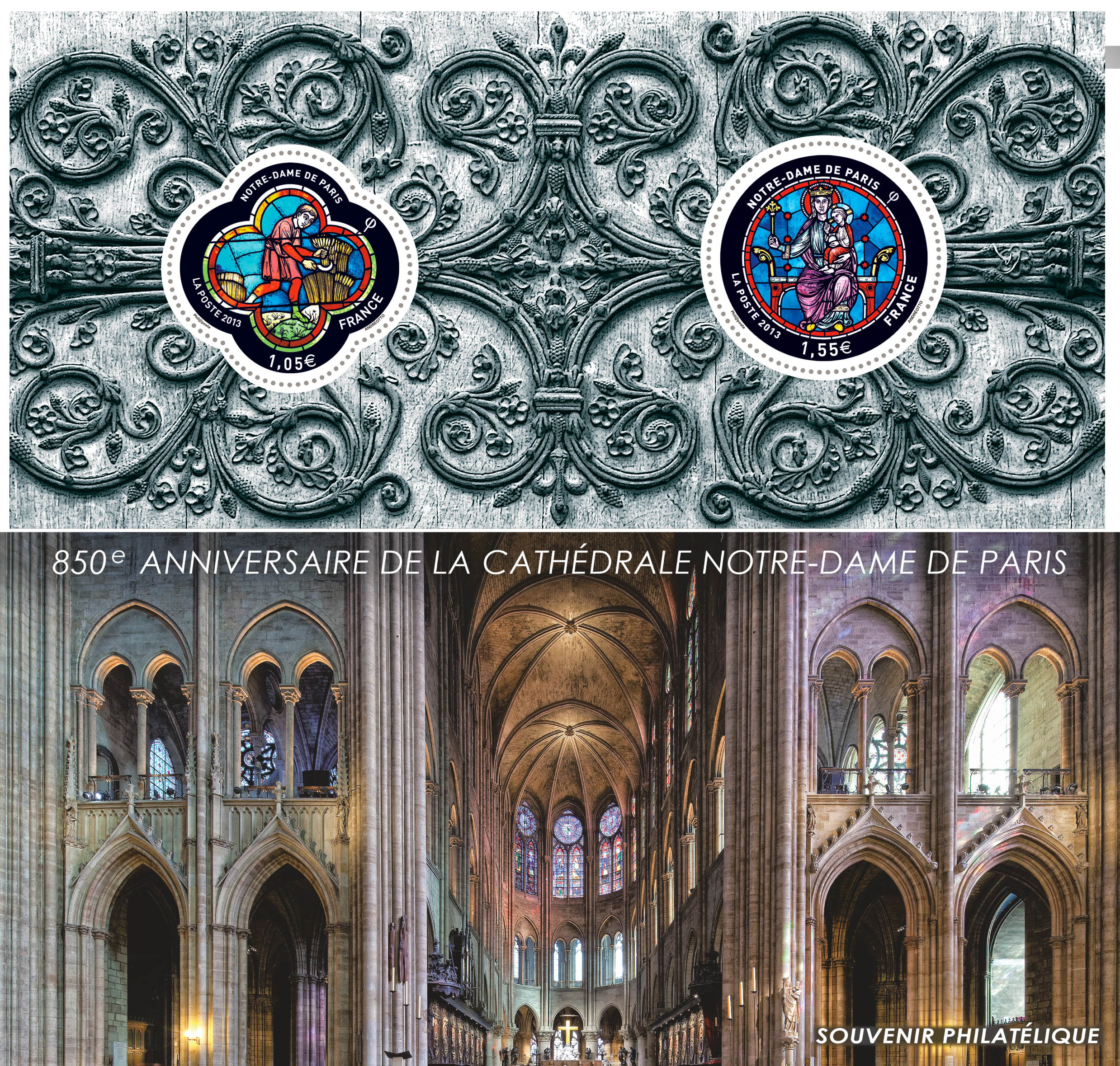 | Commentaire | Visuel : l'intérieur de la cathédrale, avec la nef et le chœur. Le feuillet : les magnifiques ferrures (pentures) du portail du Jugement Dernier, réalisées par Pierre-François Marie Boulanger (1813-1891, serrurier et ferronnier d'art), sous la direction de Viollet-le-Duc. Cathédrale gothique par excellence et monument emblématique de Paris et de la France, son édification commence en 1163 et dure plus de 170 ans. C'est le plus grand édifice religieux d'Occident jusqu'à l'érection de la cathédrale d'Amiens au XIIIe siècle. De 1847 à 1864, Lassus et Viollet-le-Duc restaurent et recomposent une partie du décor sculpté d'après des documents anciens ou des oeuvres des cathédrales de Chartres, Reims ou Amiens. Sa célèbre façade occidentale a exercé une influence considérable dans l'Europe entière, par son équilibre et son harmonie sans équivalent. Son chevet, véritable chef-d'oeuvre de légèreté, évoque une nef avec des rames. La cathédrale renferme de célèbres orgues, une collection de peintures insignes et un “trésor”. La cathédrale est également un haut-lieu de la conscience nationale. Philippe le Bel y a ouvert en 1302 les premiers États Généraux du Royaume de France, Henri IV y a épousé Marguerite de Valois en 1572 et le pape Pie VII y a sacré Napoléon Ier empereur des Français en 1804. C’est dans ses murs que l’on célèbre, depuis 1447, le “Te Deum de la victoire”.