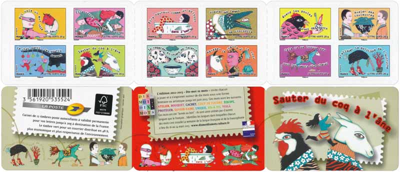 | Commentaire | Chaque langue possède son registre d’expressions imagées qui sont propres a sa culture et a sa manière d’appréhender le monde. Ces expressions jouent sur la différence entre le sens et la signification : ainsi " Donner sa langue au chat " ne signifie pas s’arracher la langue pour en faire le repas du matou mais bien renoncer à deviner, demander la solution d’une énigme. L’expression est a prendre au sens figuré imagé, et non au sens propre. Le français est une des langues les plus riches en expressions imagées dont douze d’entre elles illustrent les timbres de ce carnet. |