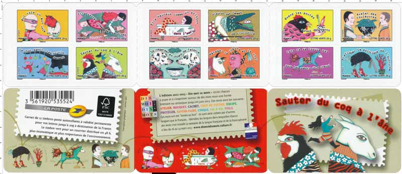 | Commentaire | Chaque langue possède son registre d’expressions imagées qui sont propres a sa culture et a sa manière d’appréhender le monde. Ces expressions jouent sur la différence entre le sens et la signification : ainsi " Donner sa langue au chat " ne signifie pas s’arracher la langue pour en faire le repas du matou mais bien renoncer à deviner, demander la solution d’une énigme. L’expression est a prendre au sens figuré imagé, et non au sens propre. Le français est une des langues les plus riches en expressions imagées dont douze d’entre elles illustrent les timbres de ce carnet. |