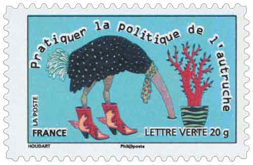 | Commentaire | " Pratiquer la politique de l’autruche " : refuser d'accepter le danger. Ignorer volontairement le danger ou l’échec. Cette expression rappelle la légende selon laquelle les autruches s'enfouissent la tête dans le sable lorsqu'elles ont peur, ce qui leur évite de voir ce qui les menace. " Appliquer la politique de l'autruche " signifie donc que l'on refuse de voir le danger là où il est. |