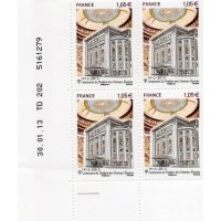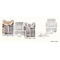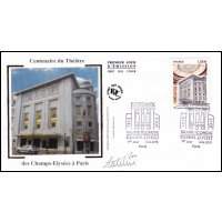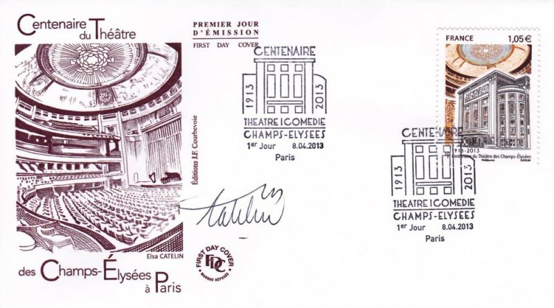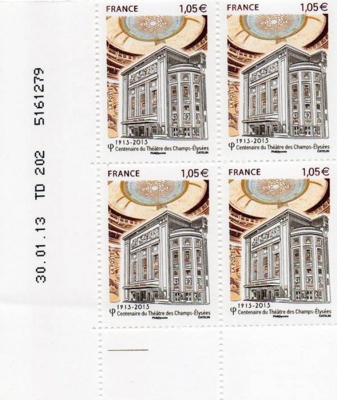| Commentaire | Feuille de 6 bandes de 8 TP En savoir plus sur Wikipédia : Théâtre des Champs-Élysées Le Théâtre des Champs-Élysées est sans conteste l'un des plus beaux lieux de spectacles parisiens. Construit en 1913, il a la particularité d'avoir été conçu par un groupe d'artistes : les architectes Henry Van de Velde puis Auguste Perret, le peintre et sculpteur Antoine Bourdelle, le peintre Maurice Denis, ainsi que le cristallier René Lalique pour ne citer que les principaux d'entre eux. Il fut le premier théâtre parisien à être entièrement construit en béton armé. L'aventure artistique du Théâtre des Champs-Élysées est illustrée par la présence des artistes les plus prestigieux de l'histoire de la musique, de l'opéra et de la danse. Fleuron de l'architecture française du XXe siècle, il fut dès 1953 l'un des premiers édifices du patrimoine architectural contemporain à être classé Monument Historique. Depuis 1970 la Caisse des Dépôts et Consignations, propriétaire du bâtiment du 15 avenue Montaigne, est le principal mécène du Théâtre. La façade et la coupole du théâtre illustrent le timbre. La particularité de ce timbre est l'usage d'une encre taille-douce dorée en report et en taille directe. Timbre à date “Premier Jour” conçu par Elsa Catelin |