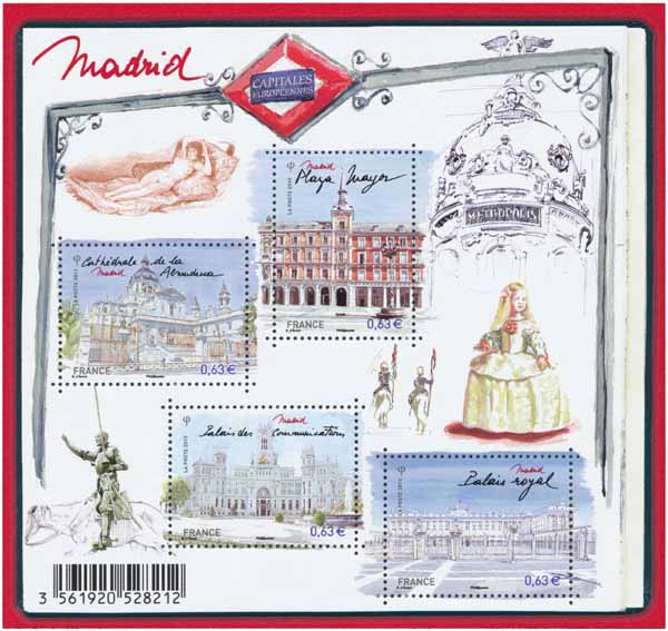 | Commentaire | Cette année, la série “Capitales européennes” est consacrée à Madrid. Quatre des principaux monuments ou sites touristiques sont représentés sur le bloc. La Plaza Mayor est un des points de rassemblement et de départ de tout itinéraire à travers la capitale. Dotée de 9 portes d'accès, cette place est entourée d’arcades aux nombreux magasins et cafés. Construite en 1897 et dédiée à la sainte patronne de Madrid, la Cathédrale de la Almudena est de style néogothique, avec une façade néoclassique. Le Palais royal, construit à la place de l'ancien Alcazar détruit en 1734 par un incendie, allie le style baroque à la tradition des résidences royales espagnoles. Sur la Plaza de Cibeles, le Palais des Communications, initia lement construit pour abriter les Postes et Télégraphes, est aujourd’hui le siège de la Mairie de Madrid. Deux oeuvres très connues “La Maja nue” de Francisco de Goya et “Les Ménines” de Diego Vélasquez, toutes deux exposées au Musée du Prado, viennent enrichir le fond de bloc.