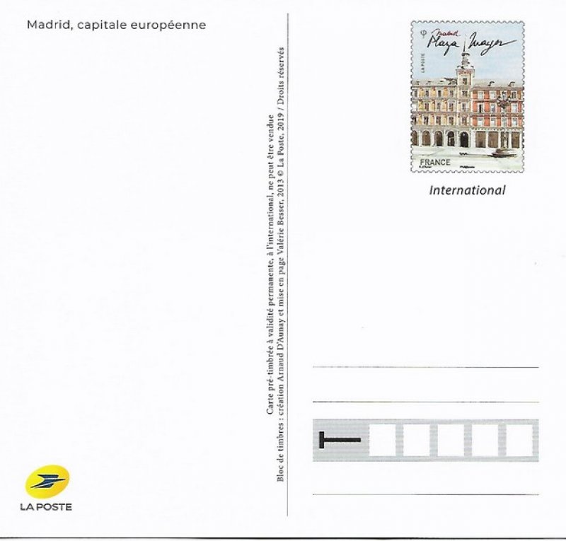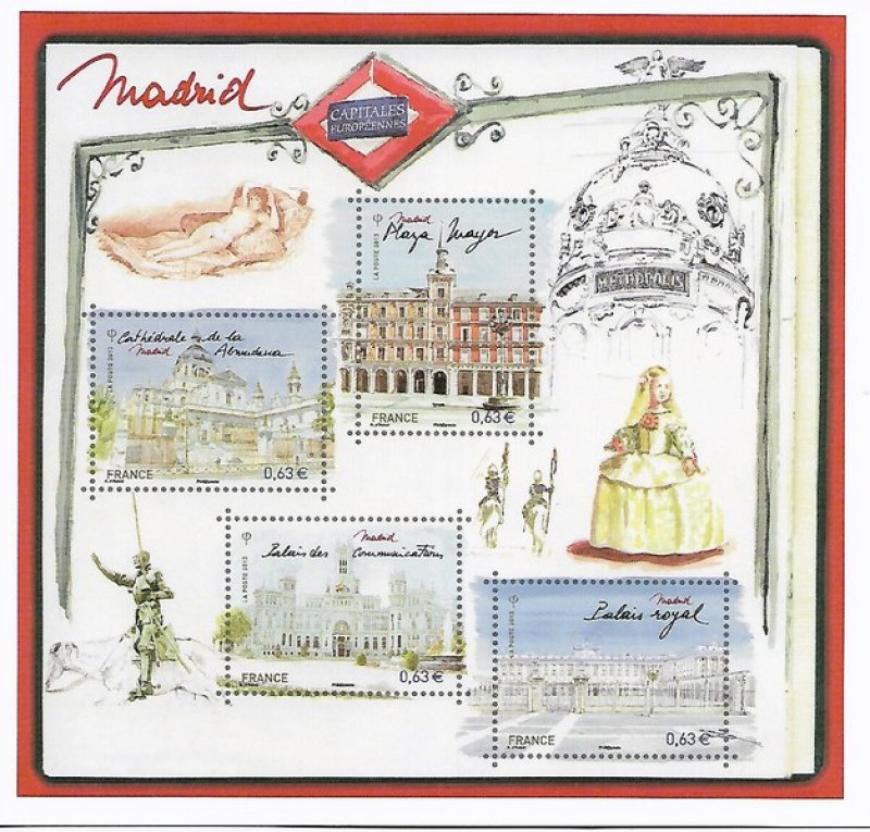 | Commentaire | Cette année, la série “Capitales européennes” est consacrée à Madrid. Quatre des principaux monuments ou sites touristiques sont représentés sur le bloc. La Plaza Mayor est un des points de rassemblement et de départ de tout itinéraire à travers la capitale. Dotée de 9 portes d'accès, cette place est entourée d’arcades aux nombreux magasins et cafés. Construite en 1897 et dédiée à la sainte patronne de Madrid, la Cathédrale de la Almudena est de style néogothique, avec une façade néoclassique. Le Palais royal, construit à la place de l'ancien Alcazar détruit en 1734 par un incendie, allie le style baroque à la tradition des résidences royales espagnoles. Sur la Plaza de Cibeles, le Palais des Communications, initia lement construit pour abriter les Postes et Télégraphes, est aujourd’hui le siège de la Mairie de Madrid. Deux oeuvres très connues “La Maja nue” de Francisco de Goya et “Les Ménines” de Diego Vélasquez, toutes deux exposées au Musée du Prado, viennent enrichir le fond de bloc.