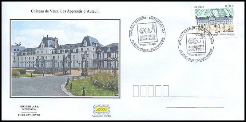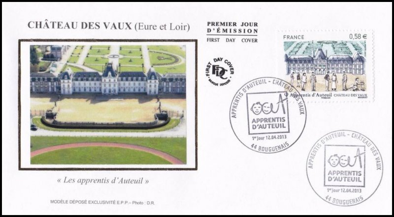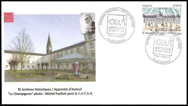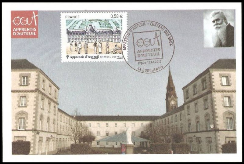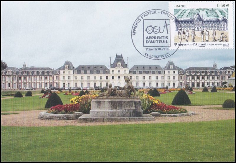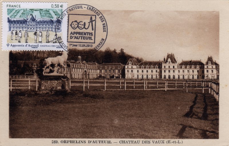 | Commentaire | Feuille de 8 bandes de 6 TP En savoir plus sur Wikipédia : Apprentis d'Auteuil Fondée en 1866, la Fondation d’Auteuil était à l’origine tournée vers l’éducation des orphelins. “Créer, agir et innover pour le service des enfants les plus démunis” était le mot d’ordre des deux fondateurs. Fondation catholique, elle se consacre aujourd’hui à l’insertion et la formation des jeunes en difficulté sociale. Elle a été reconnue d’utilité publique dès 1929 et accueille près de 9 500 jeunes. Le château des Vaux, situé à 40 km de Chartres, est l’un de ses établissements phares. Au coeur d’un parc boisé de 110 ha, il est composé de bâtiments datant du XVIIe siècle, agrandis et décorés dans les années 1880. Les anciens jardins à la française ont été transformés en potager-école où travaillent les élèves du lycée horticole.