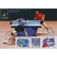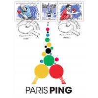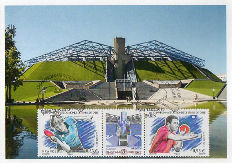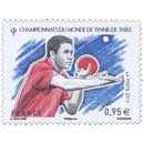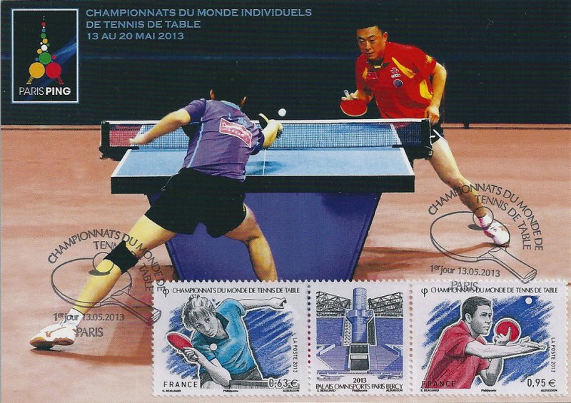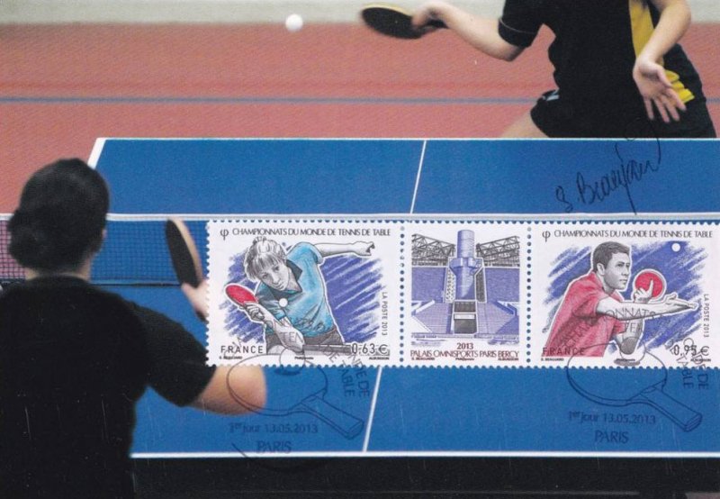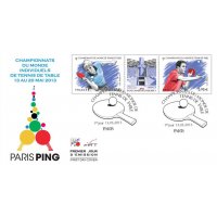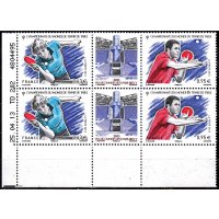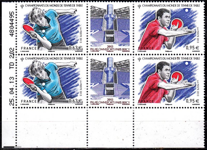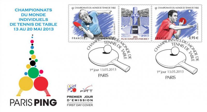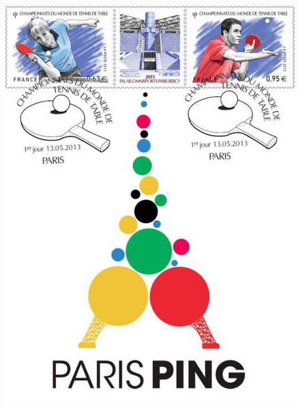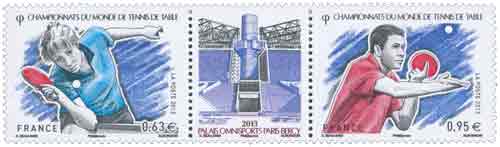 | Commentaire | Feuille de 4 bandes de 4 TP. Diptyque horizontal avec une vignette centrale 106 x 30 mm En savoir plus sur Wikipédia : Championnats du monde de tennis de table 2013 Universel et olympique, le tennis de table peut se targuer d'être le sport et le loisir le plus pratiqué dans le monde. La Fédération française, créée le 30 mars 1927, affiche quelque 3 600 clubs et compte près de 200 000 compétiteurs. Programmé du 13 au 20 mai 2013 au Palais Omnisports de Paris Bercy, ce championnat du monde individuel sera le quatrième organisé en France.