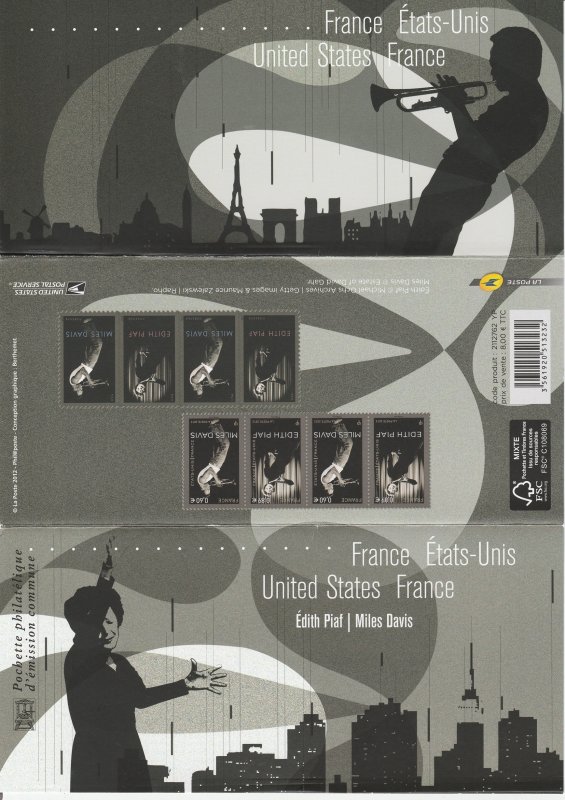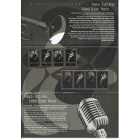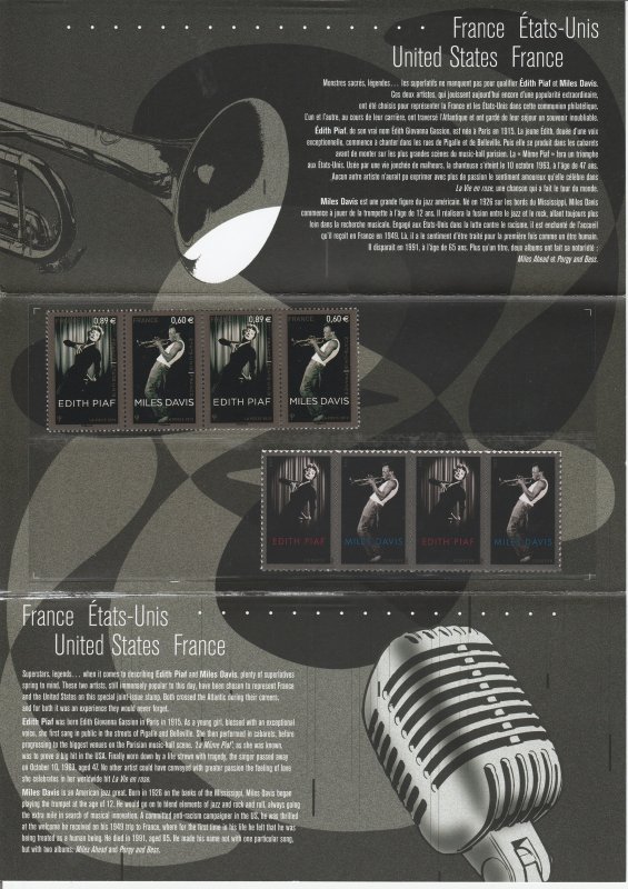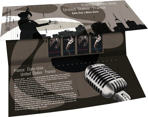 | Commentaire | Monstres sacrés, légendes… les superlatifs ne manquent pas pour qualifier Édith Piaf et Miles Davis. Ces deux artistes, qui jouissent aujourd’hui encore d’une popularité extraordinaire, ont été choisis pour représenter la France et les États-Unis dans cette communion philatélique. L’un et l’autre, au cours de leur carrière, ont traversé l’Atlantique et ont gardé de leur séjour un souvenir inoubliable. |