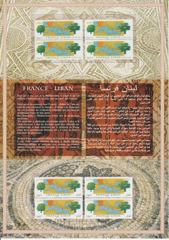 | Commentaire | La manifestation premier jour a lieu le 20 novembre à l'Institut du monde arabe, à Paris. Le cachet d'oblitération, dessiné par Christophe Drochon, reprend l'image d'un cèdre du Liban. La France et le Liban émettent conjointement un timbre-poste symbolisant les liens qui unissent nos deux pays. Sur un fond de carte du bassin méditerranéen, les arbres emblématiques des 2 pays, un cèdre et un chêne, illustrent le visuel. |