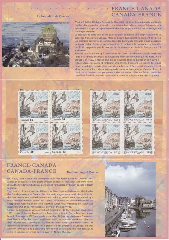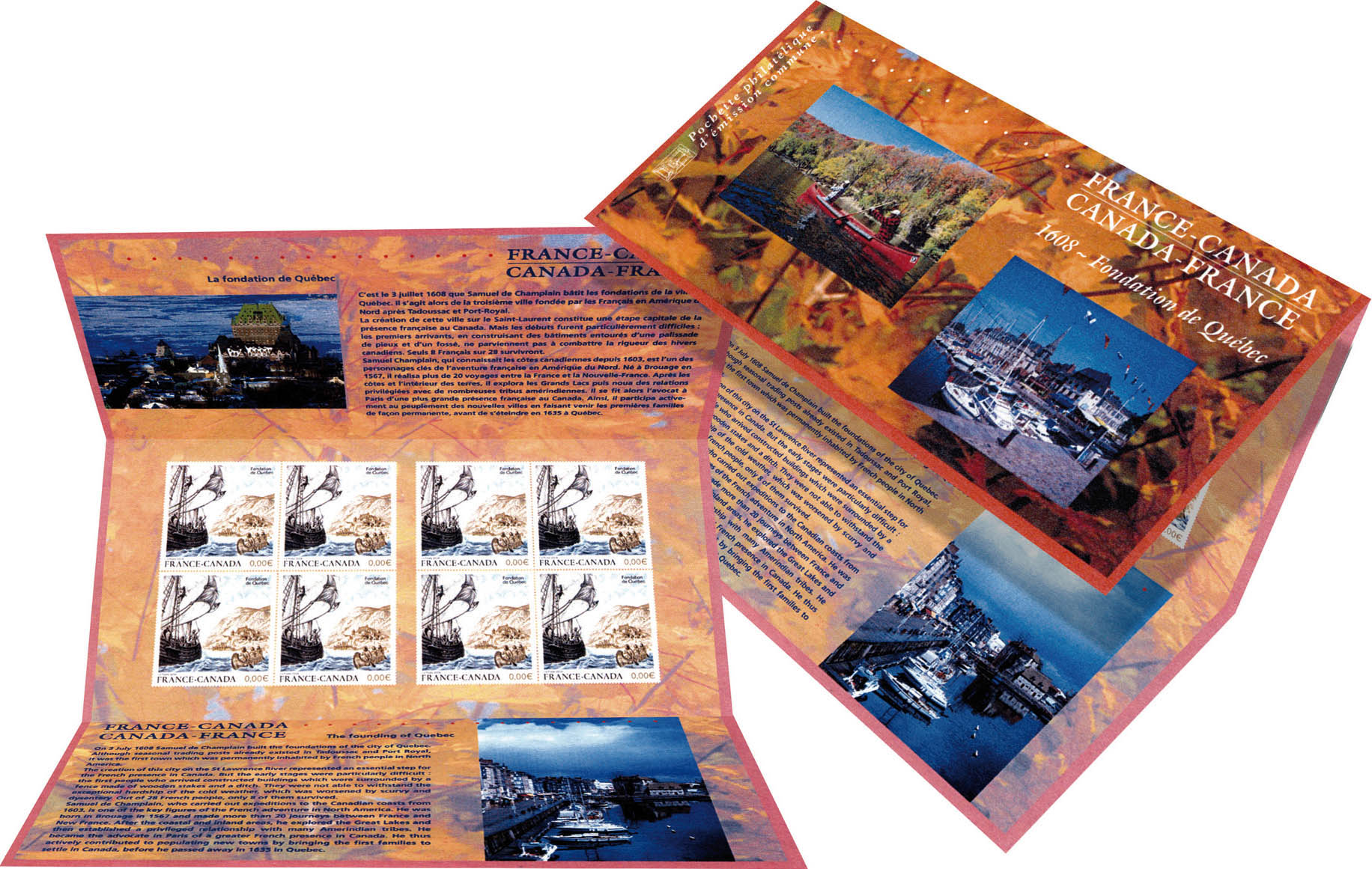 | Commentaire | 400° anniversaire de la fondation de la ville de Québec. Samuel de Champlain saluant les autochtones. La manifestation premier jour a lieu du 16 au 18 mai à Honfleur, point de départ en 1604 du voyage d'exploration du fleuve Saint-Laurent par de Champlain, et le 16 mai au Centre culturel canadien à Paris. Un cachet commémoratif sans mention « premier jour » est disponible le 16 mai à Nantes et les 16 et 17 mai à Royan, dans la région natale de Champlain. Le portrait de l'explorateur est dessiné par Francis Fugazi sur le timbre à date français. A l’occasion du 400e anniversaire de la fondation de Québec La Poste réalise une émission commune de timbres-poste avec La Poste canadienne. Les deux pays France et Canada auront le même visuel qui représente Champlain revenant à Québec, après une expédition, où les habitants l’accueillent. |