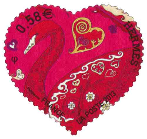 En 2000, La Poste émet pour la première fois une série de timbres en forme de coeur. C’est un créateur, de l’univers de la haute-couture ou du luxe, qui est ainsi mis à l’honneur chaque année. La Maison de haute-couture Yves Saint-Laurent est la première à poser sa marque sur ces quelques centimètres carrés, puis vont se succéder : Christian Lacroix, Torrente, Chanel, Cacharel, Jean-Louis Scherrer, Givenchy, Sorbier, Ungaro, Lanvin, Maurizio Galante, Adeline André et en 2013, la maison Hermès. Le carré de soie Hermès 90 x 90 est, depuis 1937, symbole de créativité, de raffinement et de savoir-faire. Il doit son caractère intemporel aux nombreux artistes et illustrateurs qui l’ont dessiné, enrichi, parfois détourné. Ainsi, au fil des saisons et des collections, le carré Hermès s’est toujours renouvelé tout en gardant le style et l’exigence de qualité qui l’ont rendu célèbre. La dessinatrice Zoé Pauwels collabore avec la maison Hermès depuis 1984. Elle a dessiné plusieurs carrés, dont De tout Coeur.