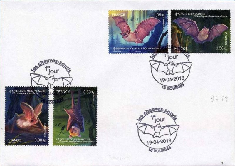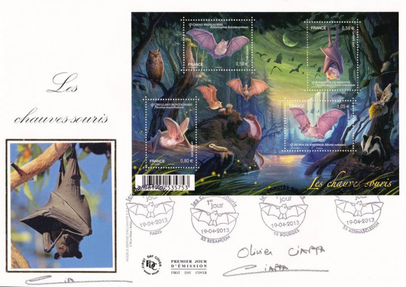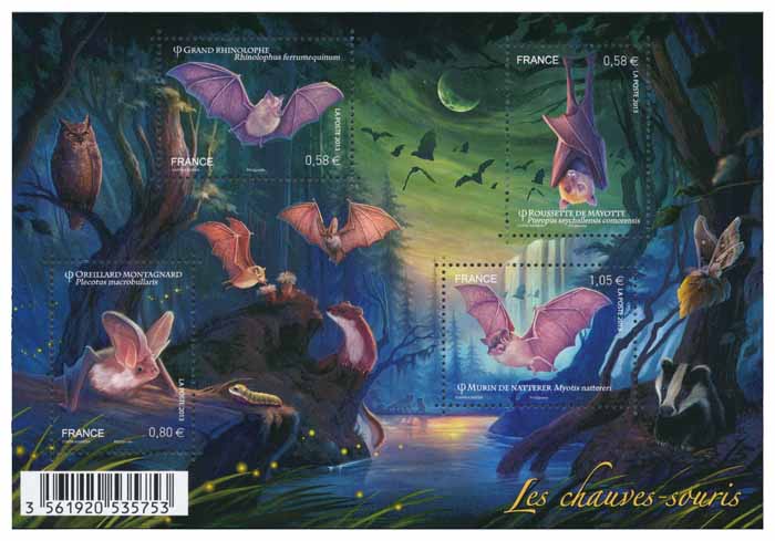 | Commentaire | Les chauves-souris nous fascinent depuis la nuit des temps. Ces petits mammifères, dont on retrouve des premières traces voici 55 millions d’années, comptent près de 1 200 espèces et ont colonisé pratiquement toutes les parties du globe. Nommées “chiroptères” par les scientifiques, leur comportement, leur mode d’alimentation et leur morphologie sont des plus variés. Les chauves-souris d’Europe se dirigent par écholocation en émettant des ultrasons dont elles captent l’écho en retour. Les roussettes utilisent leur vue et leur odorat pour trouver les fruits dont elles se nourrissent. Elles se déplacent dans l’air par des battements de leurs ailes, composées d’une fine peau tendue. Maîtrisant tous les styles de vol, elles savent effectuer des pointes de vitesse à plus de 50 km/h ou se maintenir en stationnaire comme les colibris. Pour hiberner ou se reposer les chauves-souris se pendent par leurs griffes la tête en bas sans dépenser d’énergie. Quatre espèces sont illustrées sur les timbres de ce bloc : Le grand rhinolophe, la roussette de Mayotte, le murin de Natteter, l’oreillard montagnard.
