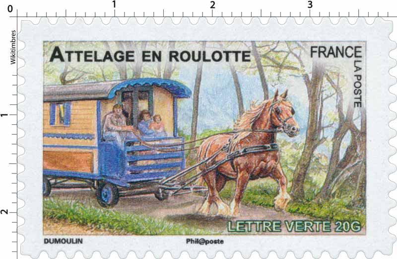 Timbre : Attelage en roulotte Mesures Format d'imp 33 x 20 mm Dents incluses 38 x 24 mm Forme horizontal Phosphore 1 barre à droite Impression héliogravure Complément xxxxx Couleur quadrichromie Valeur sans valeur faciale Dentelure 11 Emis en carnet de 12 TP Quantité 4 200 000 Auteurs Dessinateur Élodie Dumoulin Graveur xxxxx Mise en page xxxxx Mentions Création d'Élodie Dumoulin Numéros & Dates N° Philatelix - N° Michel - Date d'émission 08/04/2013 Date de retrait 08/04/2016 Classements Groupe Chevaux de Trait de nos régions 2013 Catégorie Autoadhésifs Familles cheval / âne animal nature Usage lettre verte 20 g France Régions - Départements - Description Chevaux de Trait de nos régions : Attelage en roulotte Commentaire - Mes timbres & notes personnelles www.wikitimbres.fr