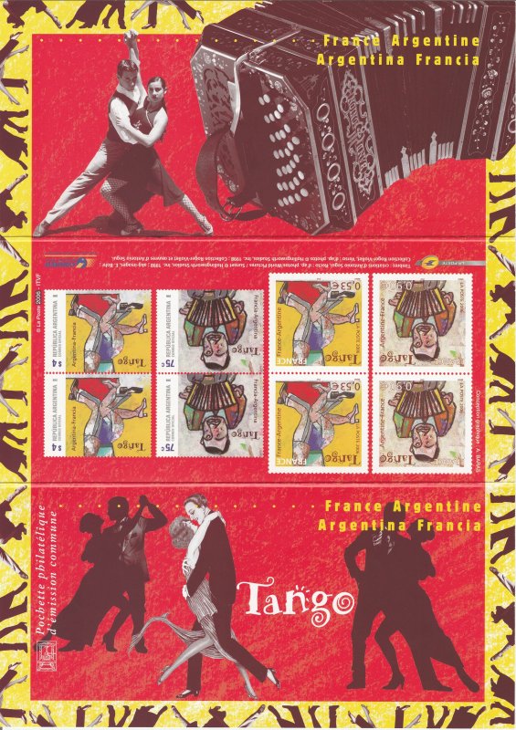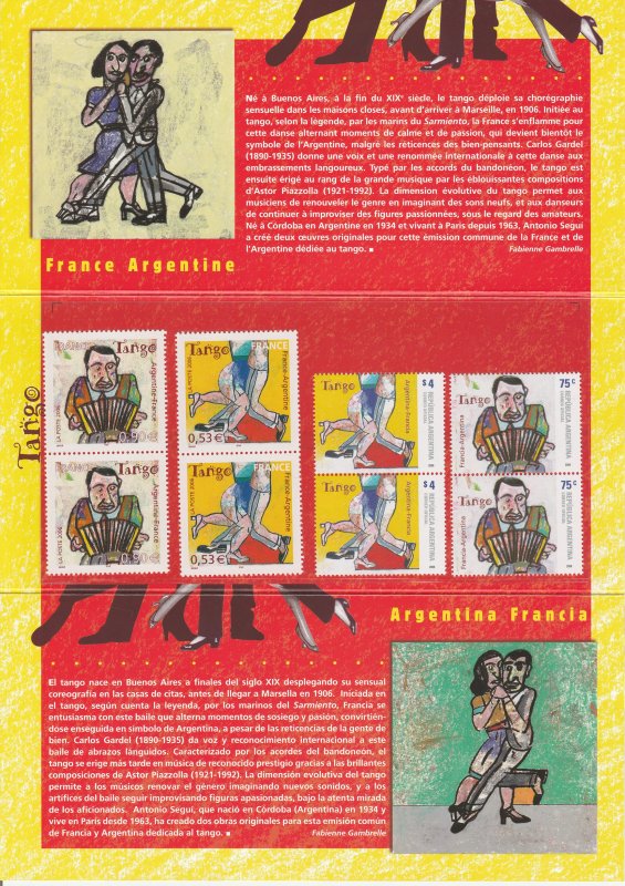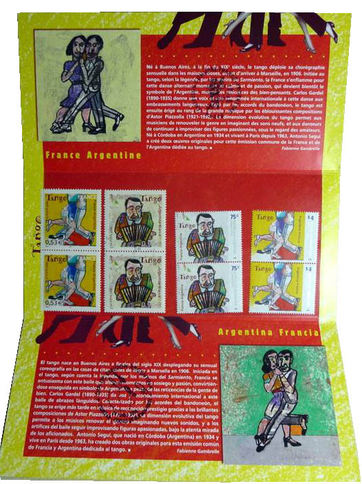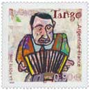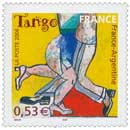 | Commentaire | Tous les ans, la Poste française procède à au moins une émission commune avec un pays étranger – la Slovaquie et l’Inde en 2003, la Belgique et le Canada en 2004, la République Tchèque et la Cité du Vatican en 2005. En 2006 a été inscrite une émission commune avec l’Argentine sur le thème du tango. Le tango, musique et danse, a connu son apogée à Buenos Aires dans les années 40 et a failli disparaître sous la dictature pour renaître et retrouver une dimension internationale dans les années 80. Danse de couple, danse sociale, poésie populaire, respect des codes … le tango est tout cela … une « pensée triste qui se danse », si justement mis en image par le peintre argentin Antonio Seguí. Émission commune avec l'Argentine |