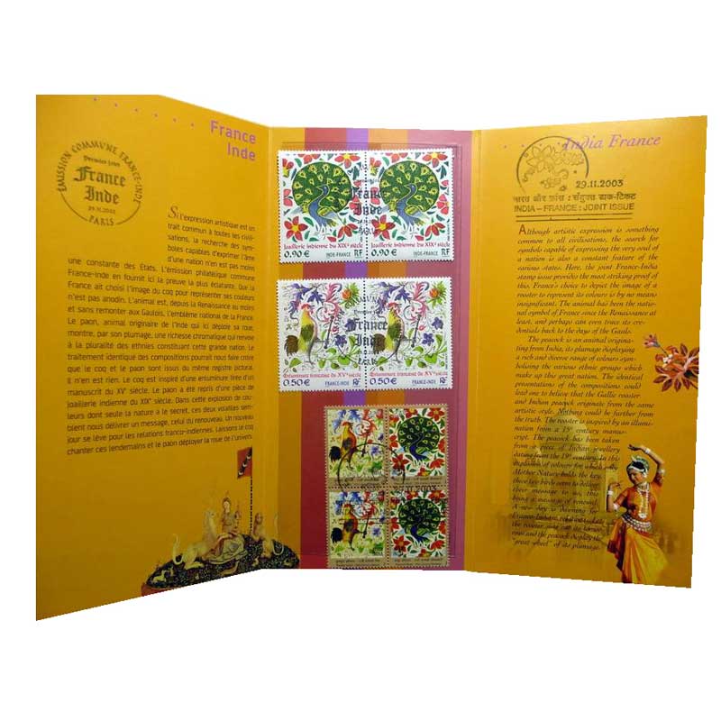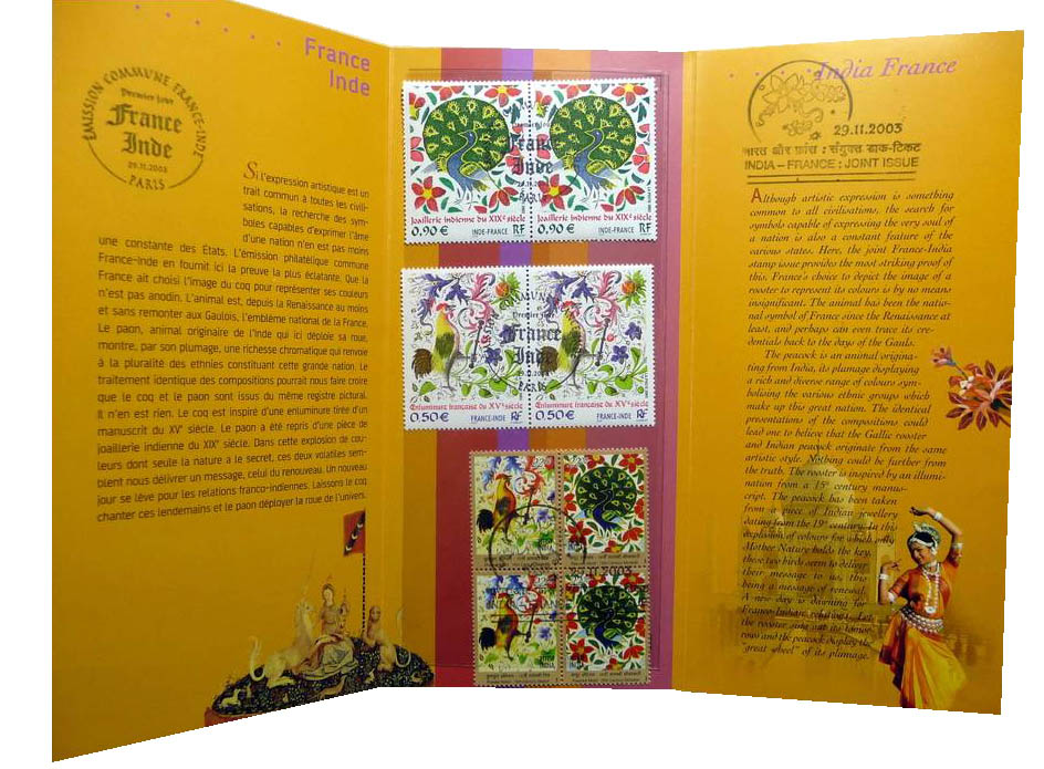 | Commentaire | Description synthétique du visuel du timbre Dans le cadre de cette émission commune France-Inde, un détail représentant un coq d’une enluminure du XVe siècle extraite du manuscrit français « Heures à l’usage de Rome » vers 1440-1450, illustre un des timbres. Émission commune avec l'Inde. |