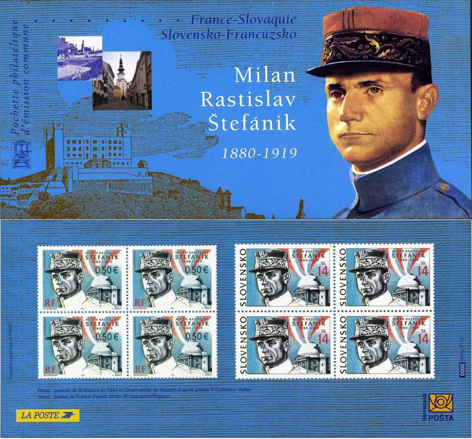 | Commentaire | Existe surchargé d'une seule bande phosphorescente à droite, existe également surchargé de deux bandes phosphorescentes à droite. Description synthétique du visuel du timbre : Milan Rastislav Štefánik est l’un des personnages les plus importants de l’histoire slovaque. Il œuvra pour soustraire les peuples tchèque et slovaque de la domination austro-hongroise et fut leur des principaux fondateurs de l’État tchécoslovaque. La France fut sa deuxième patrie. Il y vécut d’abord ses « années stellaires » durant lesquelles il travailla à l’observatoire de Meudon, prononça des traités scientifiques à l’Académie Française et organisa des expéditions d’observations astronomiques sur le Mont-Blanc. Il se consacra ensuite à une activité politique et militaire. Porté volontaire dans l’aviation française, il passa rapidement au grade de général d’aviation. Son avion s’écrasa près de Bratislava en 1919.Émission commune avec la Slovaquie. |