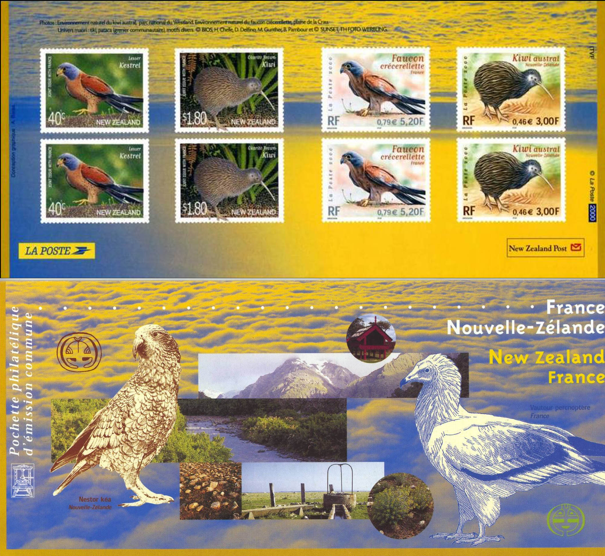 | Commentaire | Description synthétique du visuel du timbre : Les oiseaux se trouvent souvent au sommet des chaînes alimentaires, ce qui les rend sensibles aux perturbations des écosystèmes. Pour cette raison, ils sont devenus les indicateurs de santé de notre environnement et les effectifs d’une espèce traduisent le bon état ou au contraire l’altération des milieux naturels. L’avenir des espèces menacées est une préoccupation commune à la Nouvelle-Zélande et à la France. Pour cette raison deux oiseaux ont été retenus pour illustrer l’émission commune de l’année 2000. Oiseau nocturne, muni d’ailes mais ne volant pas, le kiwi ne s’apparente à aucun autre oiseau. Il est l’emblème de la Nouvelle-Zélande. 3 espèces vivent en Nouvelle-Zélande. Le kiwi austral (Apterys australis) mesure 55 cm de long et se nourrit d’invertébrés qu’il repère grâce à son odorat. Émission commune avec la Nouvelle-Zélande |