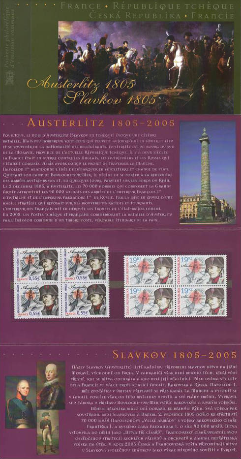 | Commentaire | Pour l’émission commune France-République tchèque, la thématique retenue pour illustrer le timbre de chaque pays est le bicentenaire de la Bataille d’Austerlitz. Le timbre français reprendra le Monument de la Paix, monument érigé sur le lieu de la bataille, et le portrait de Napoléon 1er.Émission conjointe avec la République Tchèque. |