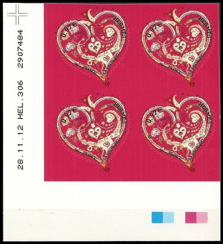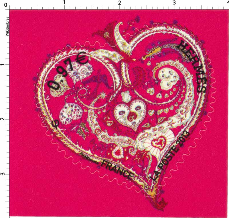 En 2000, La Poste émet pour la première fois une série de timbres en forme de coeur. C’est un créateur, de l’univers de la haute-couture ou du luxe, qui est ainsi mis à l’honneur chaque année. La Maison de haute-couture Yves Saint-Laurent est la première à poser sa marque sur ces quelques centimètres carrés, puis vont se succéder : Christian Lacroix, Torrente, Chanel, Cacharel, Jean-Louis Scherrer, Givenchy, Sorbier, Ungaro, Lanvin, Maurizio Galante, Adeline André et en 2013, la maison Hermès. Le carré de soie Hermès 90 x 90 est, depuis 1937, symbole de créativité, de raffinement et de savoir-faire. Il doit son caractère intemporel aux nombreux artistes et illustrateurs qui l’ont dessiné, enrichi, parfois détourné. Ainsi, au fil des saisons et des collections, le carré Hermès s’est toujours renouvelé tout en gardant le style et l’exigence de qualité qui l’ont rendu célèbre. La dessinatrice Zoé Pauwels collabore avec la maison Hermès depuis 1984. Elle a dessiné plusieurs carrés, dont De tout Coeur.