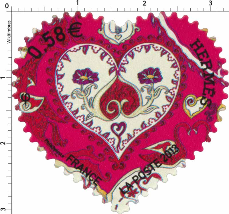 | Commentaire | En savoir plus sur Wikipédia : Hermès En 2000, La Poste émet pour la première fois une série de timbres en forme de coeur. C’est un créateur, de l’univers de la haute-couture ou du luxe, qui est ainsi mis à l’honneur chaque année. La Maison de haute-couture Yves Saint-Laurent est la première à poser sa marque sur ces quelques centimètres carrés, puis vont se succéder : Christian Lacroix, Torrente, Chanel, Cacharel, Jean-Louis Scherrer, Givenchy, Sorbier, Ungaro, Lanvin, Maurizio Galante, Adeline André et en 2013, la maison Hermès. Le carré de soie Hermès 90 x 90 est, depuis 1937, symbole de créativité, de raffinement et de savoir-faire. Il doit son caractère intemporel aux nombreux artistes et illustrateurs qui l’ont dessiné, enrichi, parfois détourné. Ainsi, au fil des saisons et des collections, le carré Hermès s’est toujours renouvelé tout en gardant le style et l’exigence de qualité qui l’ont rendu célèbre. La dessinatrice Zoé Pauwels collabore avec la maison Hermès depuis 1984. Elle a dessiné plusieurs carrés, dont De tout Coeur. |