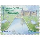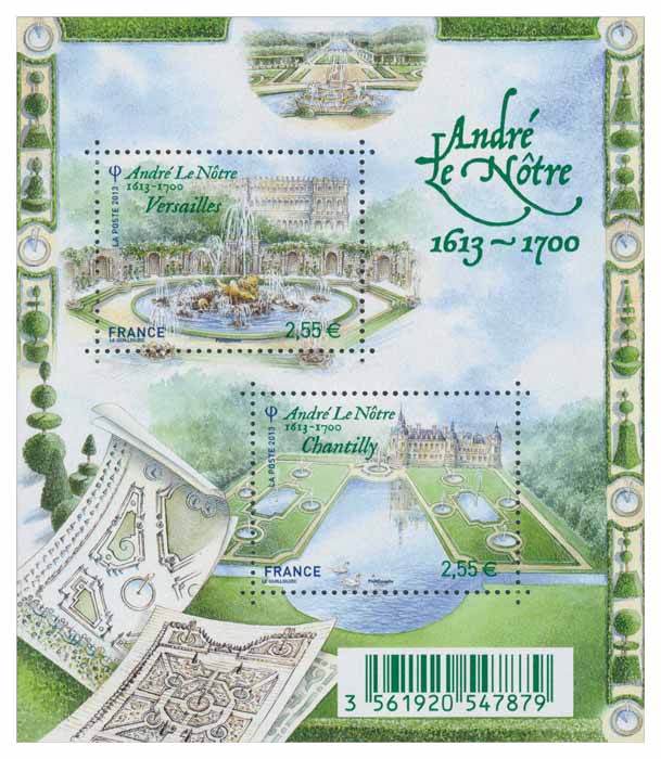 | Commentaire | Jardinier de la Cour de France, André Le Nôtre a consacré sa vie à l’aménagement des plus beaux parcs français : les parcs des châteaux de Versailles et de Chantilly, sans oublier celui de Vaux-le- Vicomte. Il donna toute sa dimension au concept de jardins à la française aux tracés géométriques, glorifiant l’art de l’ordre et de la symétrie et ennoblissant les perspectives. Le modèle français est encore de nos jours la référence ultime de la maîtrise paysagère. Cette carte souvenir, ce feuillet, ce bloc et ces prêts-à-poster lui rendent hommage en mettant en valeur ses deux principales réalisations, deux parcs où flânent chaque année des millions d’amoureux d’une nature apprivoisée, repensée pour la promenade, la réflexion, le repos de l’esprit.