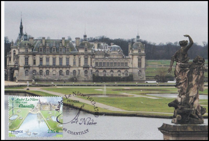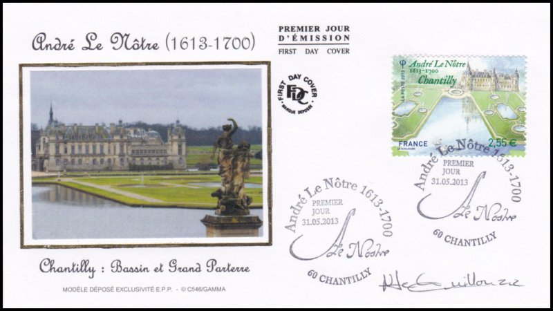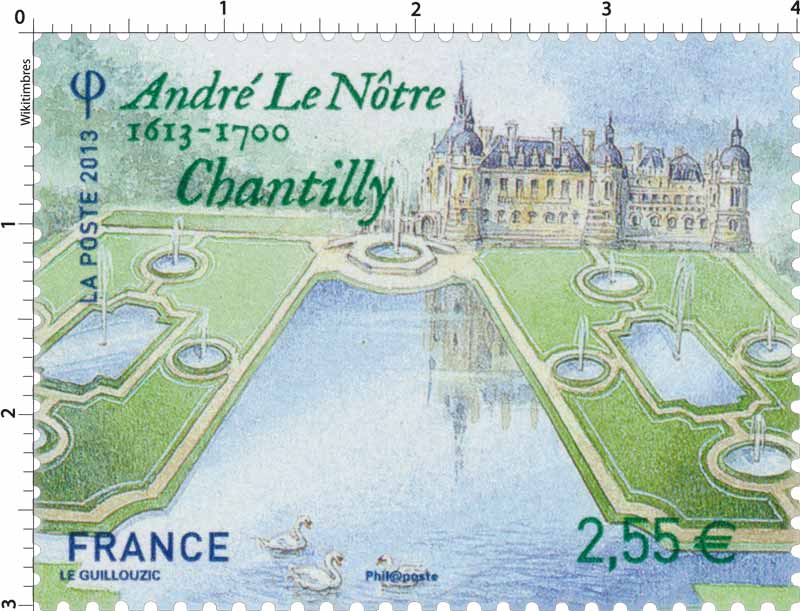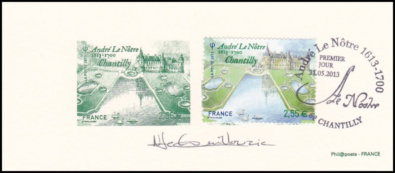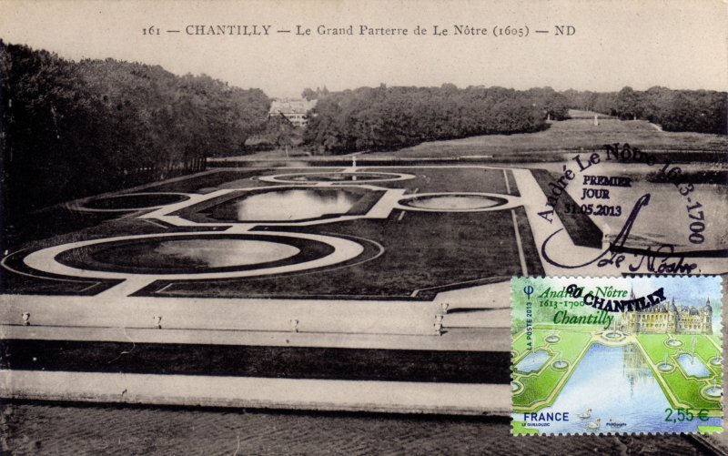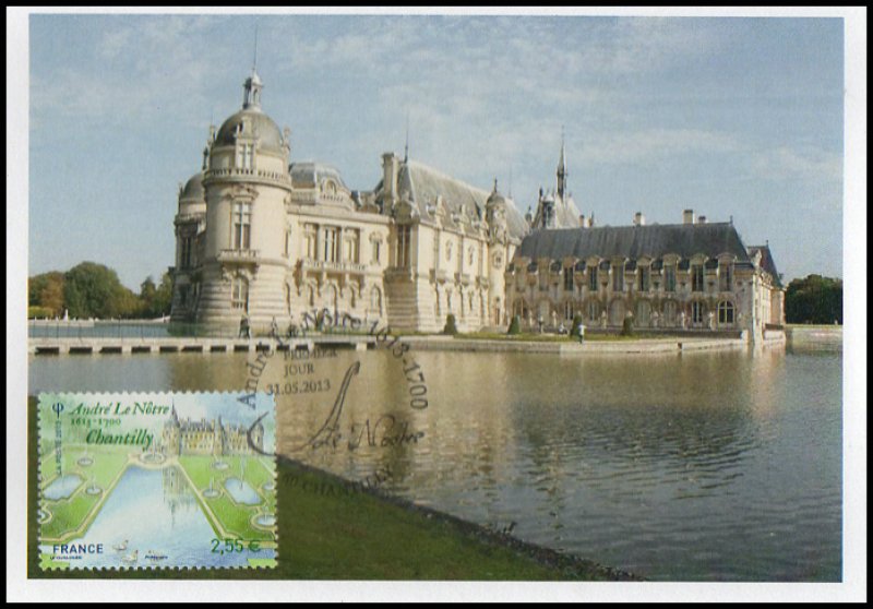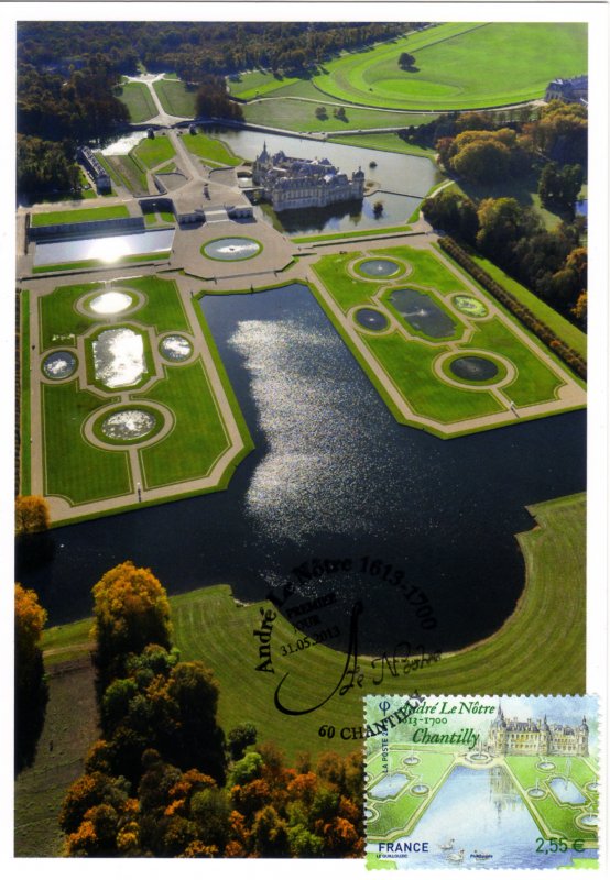 | Commentaire | En savoir plus sur Wikipédia : Château de Chantilly Jardinier de la Cour de France, André Le Nôtre a consacré sa vie à l’aménagement des plus beaux parcs français : les parcs des châteaux de Versailles et de Chantilly, sans oublier celui de Vaux-le- Vicomte. Il donna toute sa dimension au concept de jardins à la française aux tracés géométriques, glorifiant l’art de l’ordre et de la symétrie et ennoblissant les perspectives. Le modèle français est encore de nos jours la référence ultime de la maîtrise paysagère. Cette carte souvenir, ce feuillet, ce bloc et ces prêts-à-poster lui rendent hommage en mettant en valeur ses deux principales réalisations, deux parcs où flânent chaque année des millions d’amoureux d’une nature apprivoisée, repensée pour la promenade, la réflexion, le repos de l’esprit.