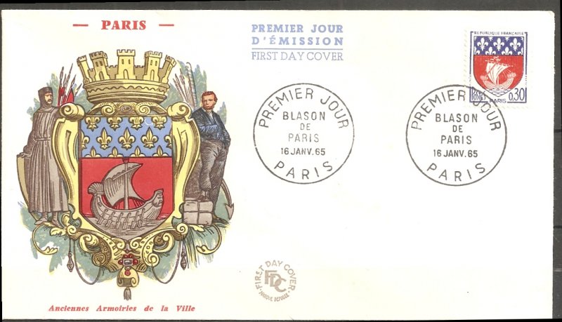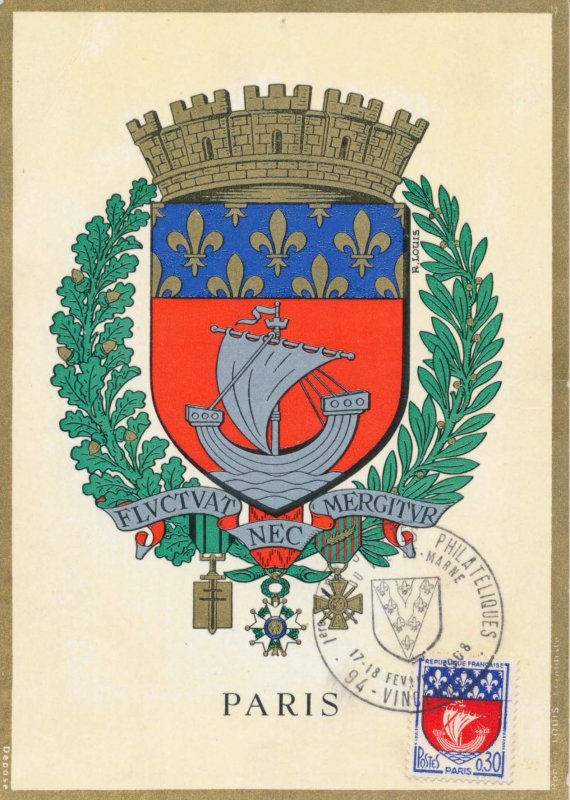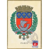 | Commentaire | Historique : Une nef, ou un vaisseau, paraissent avoir été de tout temps le symbole de la corporation des marchands de l'eau, qui donna ensuite naissance à la municipalité de Paris. On a même pu faire remonter ce symbole aux nautes de Lutèce dès l'époque gallo-romaine, même si sa forme n'a pas toujours été la même. Une première mention d'armoiries apparaît dès 1190, lorsque le roi Philippe II, dit "Philippe Auguste "(règne de sept.1180 à juil.1223), au moment de son départ pour la Terre Sainte, donne pour premières armoiries : "un écu dont le champ était de gueules, à la nef d'argent, au chef d'azur, semé de fleurs de lys d'or" |