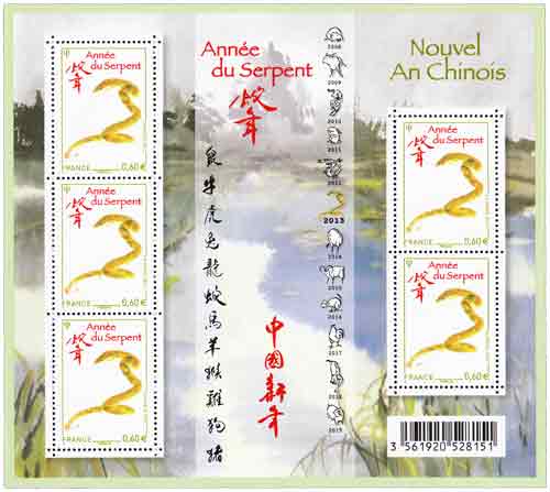 | Commentaire | Comme chaque année, La Poste fête le nouvel an chinois par le biais de l’émission d'un bloc de 5 timbres. 2013 est l'année du Serpent. Cette année encore, c’est Li Zhongyao qui a été choisi pour réaliser le bloc. En Chine, Li Zhongyao est diplômé de la faculté des Beaux-Arts de l’Institut supérieur de Nankin et en France, d’un DEA d’arts plastiques. Il enseigne et peint depuis trente ans. Ses spécialités sont la calligraphie, les paysages, les fleurs, les animaux et en particulier les oiseaux. Le calendrier chinois actuel est à quelques détails près celui qui fut instauré plus de cent ans avant notre ère par l’empereur Wudi, de la dynastie Han. D'autres calendriers préexistants faisaient débuter l’année à des dates différentes. Chaque année décline les douze signes du zodiaque chinois, associés aux 12 rameaux terrestres du cycle sexagésimal, qui se succèdent dans un ordre cyclique : rat, buffle, tigre, lapin, dragon, serpent, cheval, chèvre, singe, coq, chien, cochon. L’année est également associée à un des cinq éléments fondamentaux : métal, eau, bois, feu, terre.