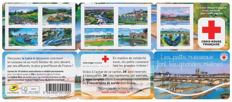 | Commentaire | 2 € seront reversés à la Croix-Rouge française Timbre à date illustré conçu par Isy Ochoa Avec 53 000 bénévoles et de plus de 17 000 salariés, la Croix- Rouge française vient en aide chaque année à plus de 2 millions de personnes, en France et dans le monde, en favorisant leur réinsertion et leur autonomie. La Poste, partenaire de l’association depuis près de 100 ans, se mobilise et émet un carnet de timbres au profit de la Croix-Rouge française. Illustrant le proverbe “Les petits ruisseaux font les grandes rivières”, ce carnet propose un voyage au long du cours de la Loire, le premier des fleuves français par sa taille et l’ampleur de son parcours. Chacun des dix timbres propose un des points de vues emblématiques ou moins connues de la Loire et de son environnement. |