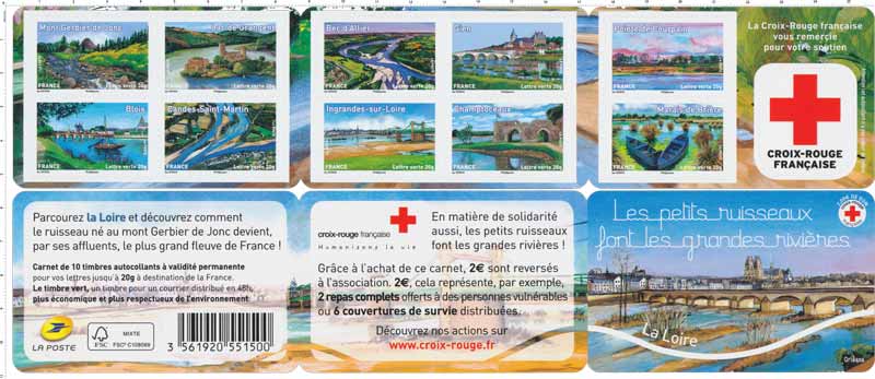 | Commentaire | 2 € seront reversés à la Croix-Rouge française Timbre à date illustré conçu par Isy Ochoa Avec 53 000 bénévoles et de plus de 17 000 salariés, la Croix- Rouge française vient en aide chaque année à plus de 2 millions de personnes, en France et dans le monde, en favorisant leur réinsertion et leur autonomie. La Poste, partenaire de l’association depuis près de 100 ans, se mobilise et émet un carnet de timbres au profit de la Croix-Rouge française. Illustrant le proverbe “Les petits ruisseaux font les grandes rivières”, ce carnet propose un voyage au long du cours de la Loire, le premier des fleuves français par sa taille et l’ampleur de son parcours. Chacun des dix timbres propose un des points de vues emblématiques ou moins connues de la Loire et de son environnement. |