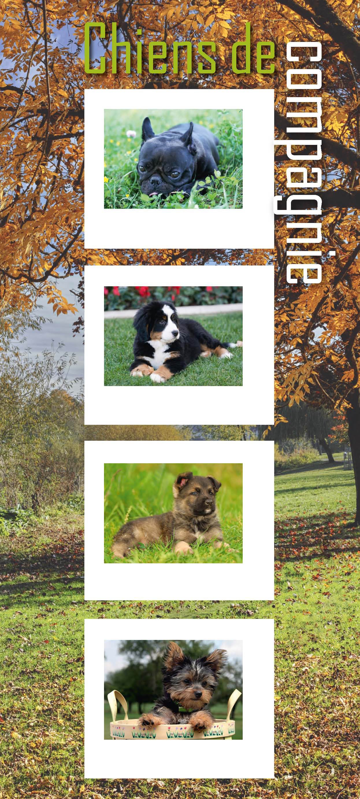 | Commentaire | Un Yrokshire Terrier, détient le record du plus petit chien. il mesurait 6,3 cm au garrot, 9 cm de la queue à la truffe et pesait 115 grammes. Le plus célèbre Berger Allemand de tous les temps “Rintintin” a joué dans 26 films, dans les années 50. Le Bouvier Bernois a longtemps été appelé le “Cheval du pauvre” du fait qu’il était utilisé pour apporter les bidons de lait sur les charrettes. Le Bouledogue français a fait l’objet d’interminables discussions entre Français et Anglais, qui en réclament chacun la paternité. |