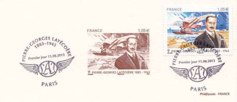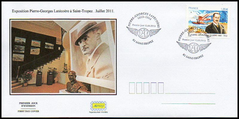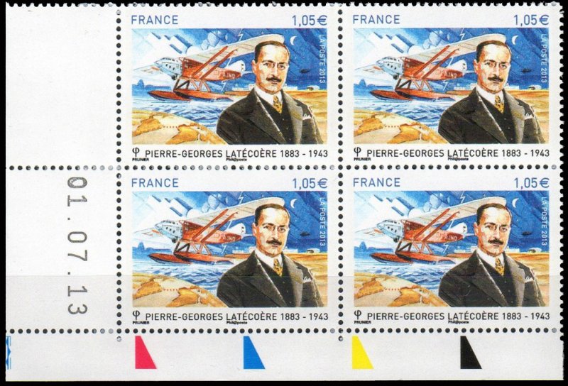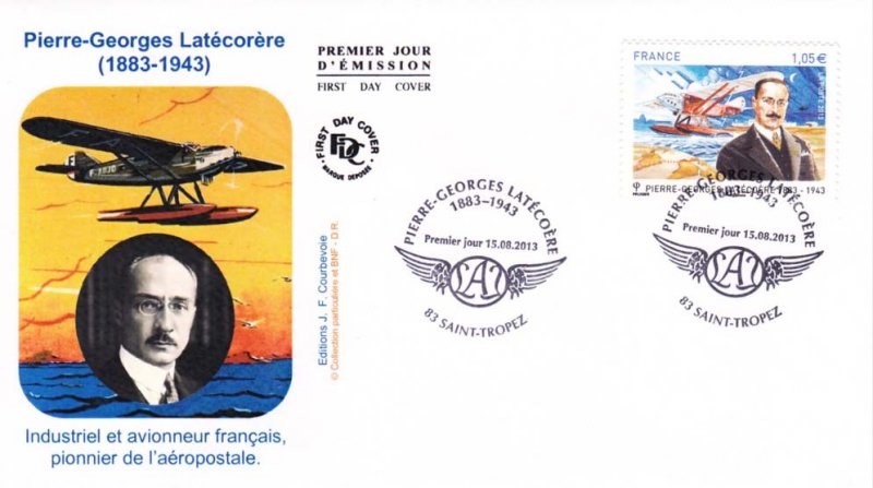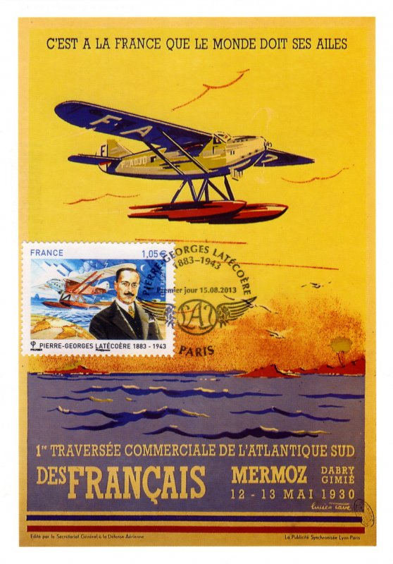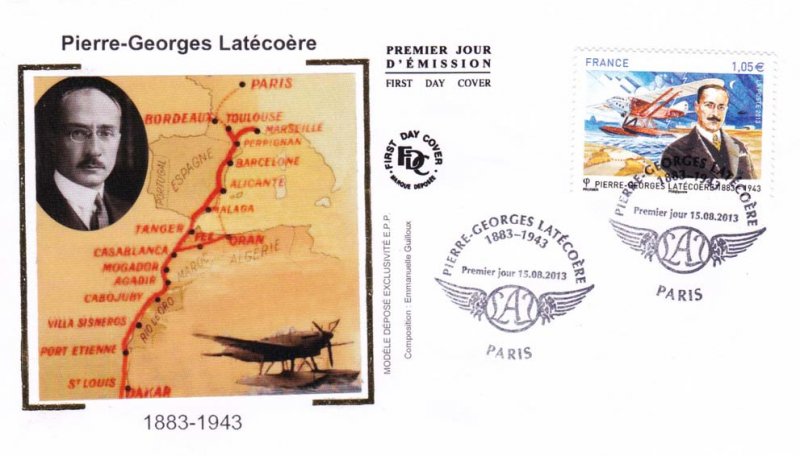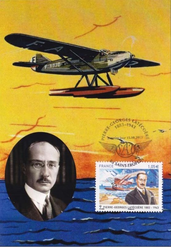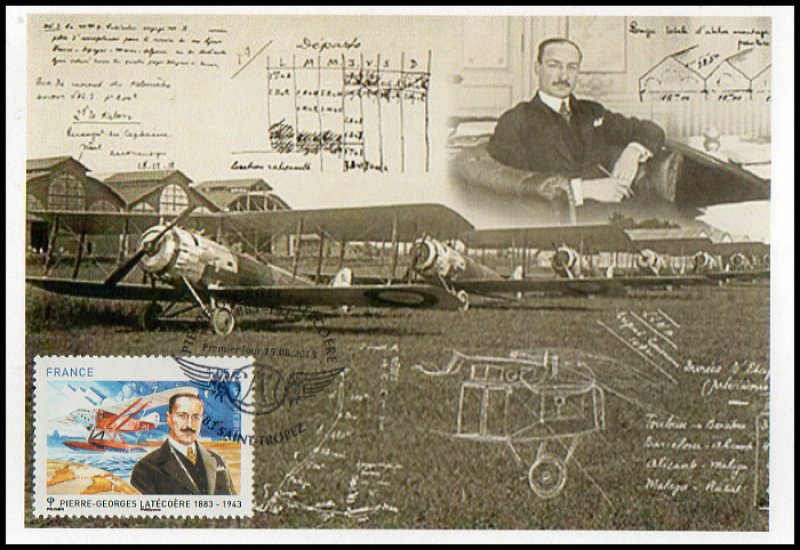 | Commentaire | Imposition : 7 bandes de 6 TP / Timbre à date “Premier Jour” conçu par Aurélie Baras En savoir plus sur Wikipédia : Latécoère Grande figure de l’industrie aéronautique française, Pierre-Georges Latécoère débute sa carrière pendant la première guerre mondiale en montant deux usines à Toulouse : une fabrique d’obus et une de cellules d’avion. Il crée en 1919 une liaison aérienne entre Toulouse et Casablanca, malgré l’opposition des autorités espagnoles. En 1924, la ligne est prolongée jusqu’à Dakar. Grand industriel, son usine de 26 000 m2 construit les avions de l’Aéropostale, à laquelle il doit céder son affaire en 1927. En mai 1930, Jean Mermoz réussit la première traversée de l’Atlantique sud dans un Laté 28 et en effectuera vingt-quatre autres dans son Laté 300 “La Croix du Sud”. Antoine de Saint-Exupéry, raconte cette épopée dans Courrier Sud et dans Vol de Nuit. Pierre-Georges Latécoère poursuit son activité et construit des hydravions de gros tonnage. Il disparaît en 1943 |