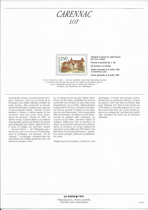| Description | Carennac, village médiéval du Lot, représentation du prieuré clunisien fondé au XIe siècle, (village près du gouffre de Padirac et de Rocamadour) |