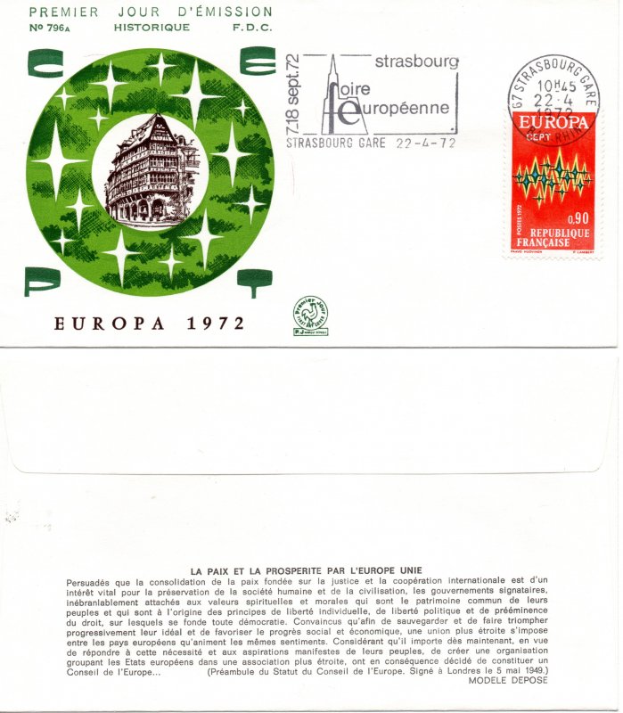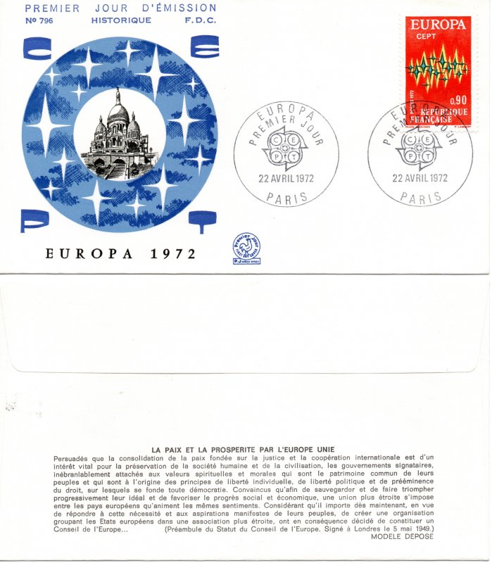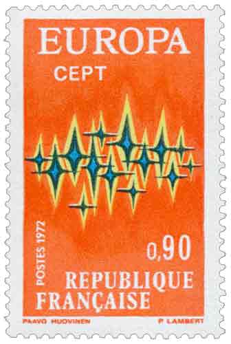 | Commentaire | Ce timbre-poste français de l’émission EUROPA – C.E.P.T. 1972 correspond à la figurine destinée au régime international, émise parallèlement à celle consacrée à la cathédrale d’Aix-la-Chapelle, et reprend le motif commun adopté par la Conférence européenne des administrations des Postes et Télécommunications pour l’ensemble des pays participants. En 1972, le thème retenu pour la série EUROPA est celui des télécommunications, sujet fédérateur à une époque où la circulation rapide de l’information devient un enjeu majeur du rapprochement européen. Le dessin, conçu à l’origine par l’artiste finlandais Paavo Huovinen, est interprété en France par Pierrette Lambert et se présente sous la forme d’une composition abstraite et dynamique, évoquant une gerbe d’étincelles multicolores. Cette stylisation symbolise la transmission des messages et des données par les différents réseaux de communication – poste, téléphone, télécommunications au sens large – et traduit visuellement l’idée d’une coopération internationale vivante et en mouvement. Contrairement aux figurines monumentales ou commémoratives plus classiques, ce timbre s’inscrit résolument dans une esthétique moderne, caractéristique des émissions EUROPA de cette période, privilégiant le symbole universel à la représentation figurative. L’impression en héliogravure renforce cet effet par un rendu très fluide des couleurs rouge orangé, jaune, vert et bleu, qui se détachent sur un fond rouge et donnent au timbre une forte lisibilité postale. Sur le plan philatélique, cette figurine s’insère dans une émission conjointe à deux valeurs, la France ayant, comme chaque année, décliné le thème EUROPA sous une double approche : abstraite et internationale avec ce timbre à 0,90 franc, figurative et patrimoniale avec la valeur intérieure à 0,50 franc. Utilisé principalement pour l’affranchissement des envois internationaux de 20 à 50 grammes, ce timbre témoigne aussi de l’évolution des usages postaux au début des années 1970, période marquée par l’intensification des échanges européens. Il illustre enfin la vocation même des émissions EUROPA : rappeler, par un graphisme commun décliné dans de nombreux pays, que le développement des communications constitue l’un des fondements essentiels de la construction européenne contemporaine. Article rédigé pour WikiTimbres |