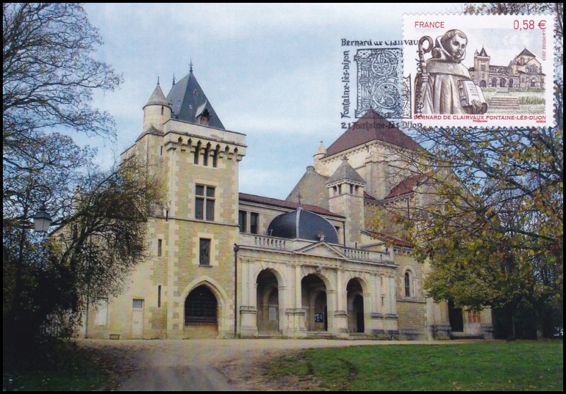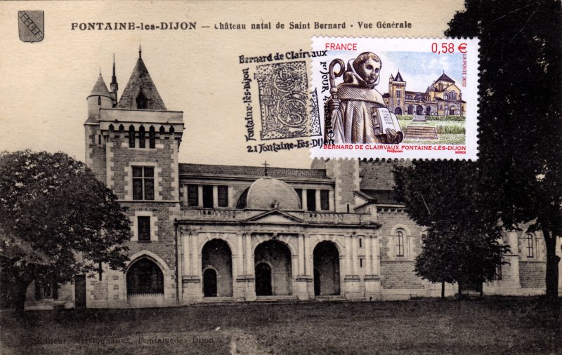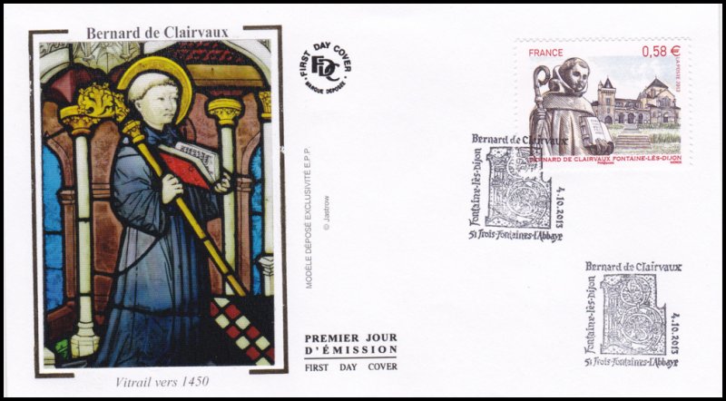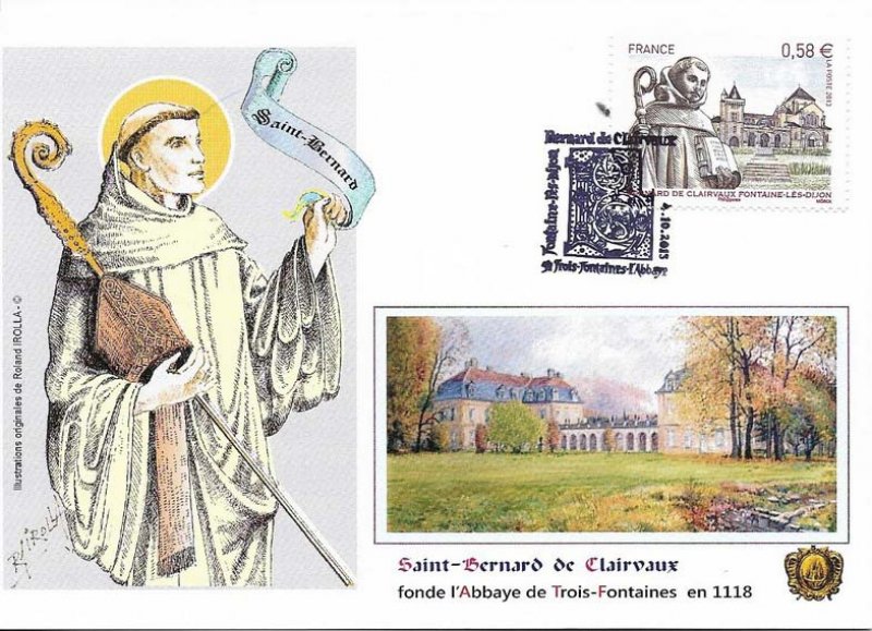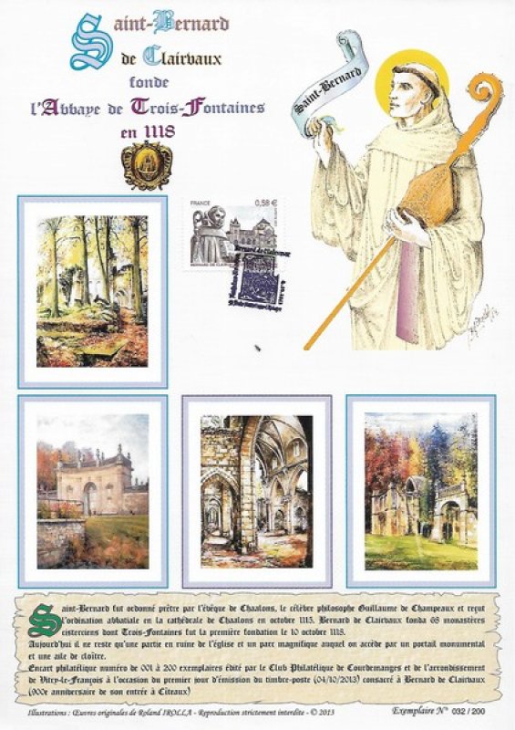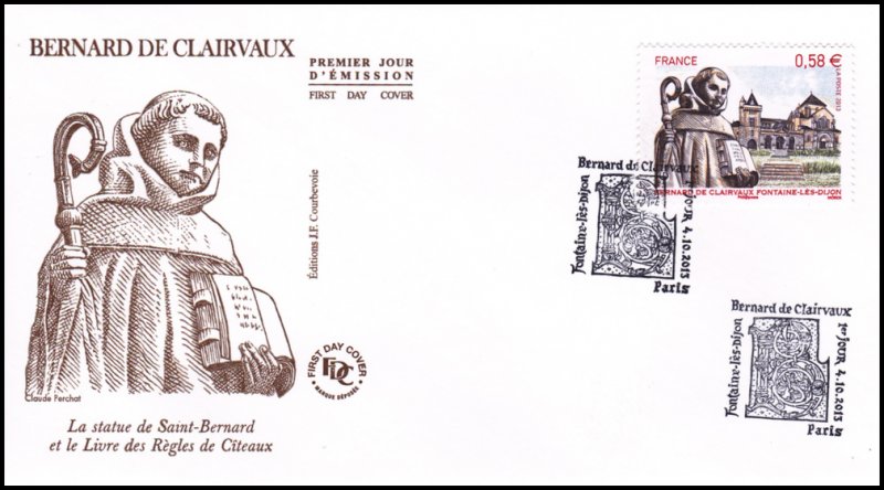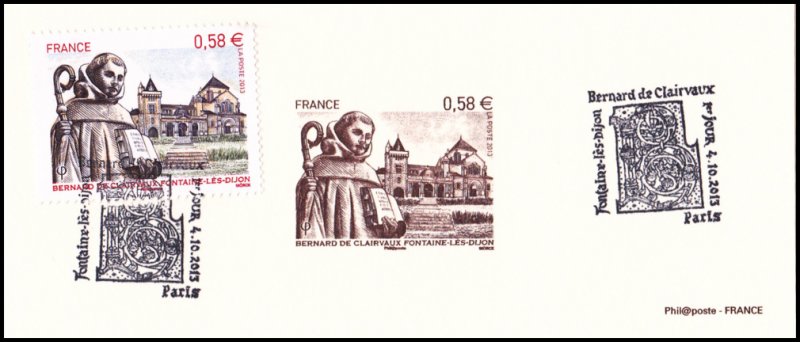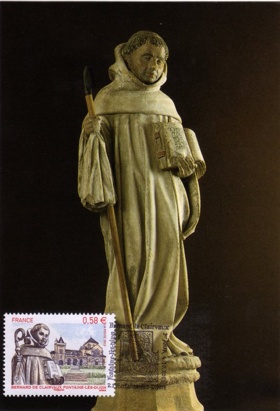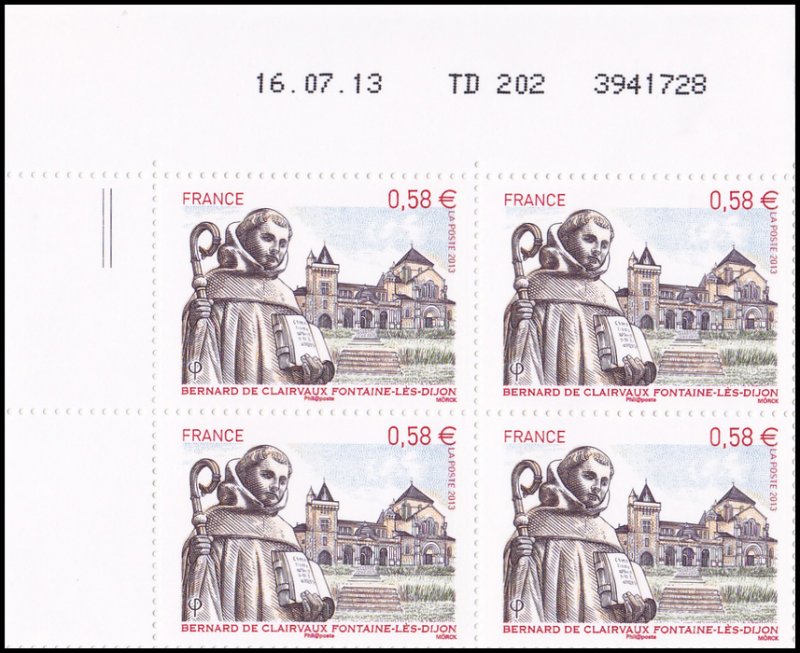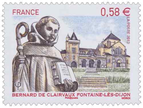 | Commentaire | Timbre à date “Premier Jour” conçu par Louis Arquer / Imposition : 8 bandes de 6 TP Homme d’influence, fin lettré et rédacteur prolixe, Bernard de Clairvaux fut au début du XIIe siècle celui qui donna son plein essor au mouvement cistercien. Né à Fontaine-lès-Dijon en 1090, dans une grande famille noble de Bourgogne, Bernard de Fontaine est le fils de Tescelin le Roux et d’Aleth de Montbard. En 1112, il entre à l’abbaye de Cîteaux, fondée en 1098 par Robert de Molesme. En 1128, il participe au concile de Troyes, dont il est nommé secrétaire, mais il est contesté par une partie du clergé, qui pense que ce simple moine se mêle de choses qui ne le regardent pas. C’est lors de ce concile que Bernard fait reconnaître les statuts de la milice du Temple, les Templiers, dont il rédige les statuts. Personnalité écoutée, il intervient dans les affaires publiques, défend les droits de l’Église contre les princes temporels, et conseille les papes. Partisan d’une ligne traditionnaliste, il combat les idées novatrices d’Abélard et le fait condamner au concile de Sens en 1140. Bernard meurt en 1153, à 63 ans. Canonisé en 1174 par Alexandre III, il a été déclaré docteur de l’Église par Pie VIII en 1830. Cinq cents abbayes cisterciennes ont été fondées sous son impulsion à travers la France et l’Europe. |
