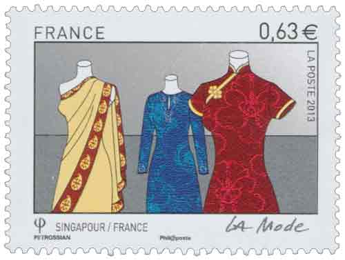 | Commentaire | Imposition : 6 bandes de 7 TP / Timbre à date “Premier Jour” 7 conçu par Stéphanie Ghinéa Singapour a invité, en décembre 2012, la nouvelle garde de la Haute Couture parisienne pour faire une démonstration de son savoir-faire en matière de style et d’élégance made in France à la haute société locale. Cette invitation, adressée à huit maisons de couture parisienne, avait pour cadre les “Fide Fashion Weeks”. Cette manifestation s’est déroulée au Marina Bay Sands, un énorme complexe hôtelier de Singapour situé face à Marina Bay. Une belle occasion pour une émission commune ! |