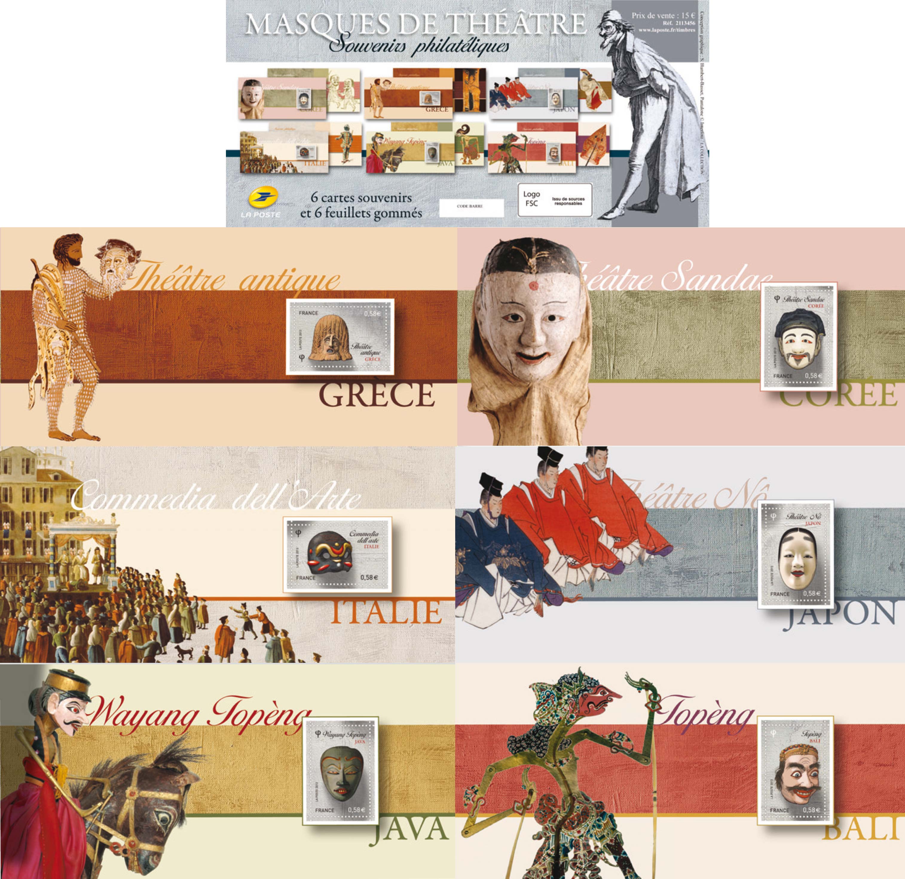 | Commentaire | Les masques représentés sur ces somptueux bloc et souvenirs philatéliques illustrent six traditions scéniques majeures : Le théâtre Sandae, apanage de la cour de Corée sous la dynastie Yi. - Le théâtre antique, Grèce : masque tragique en terre cuite provenant du site de Myrina. - Le théâtre Nô, au Japon, comporte quatre styles de masques (hommes, femmes, vieillards et démons). - La Commedia dell’arte : née au XVIe siècle en Italie, mêlant farce et tradition populaire, elle met en scène des personnages comme Polichinelle ou Arlequin. - Le théâtre Wayang Topèng : masque représentant le prince légendaire Panji, issu des collections du musée du quai Branly. - Le théâtre Topèng : théâtre dansant et musical masqué de Bali, le Topèng illustre les différents statuts de la hiérarchie sociale.