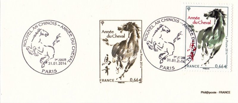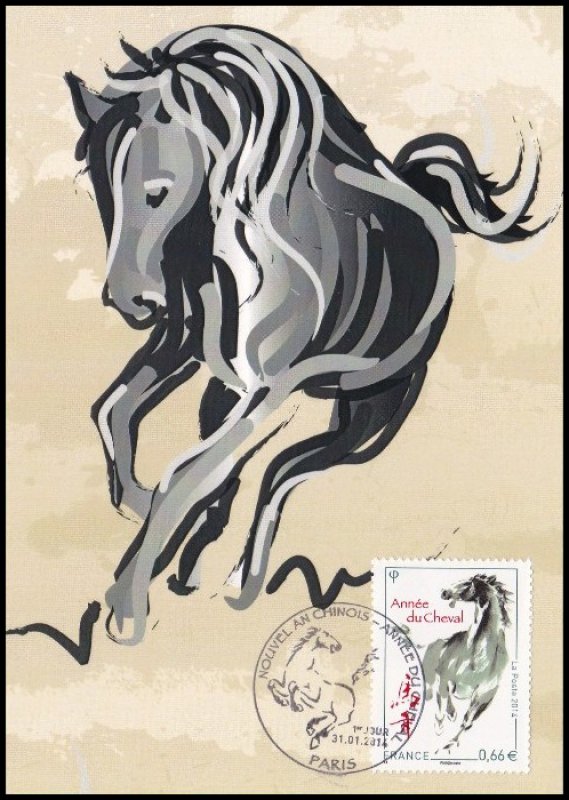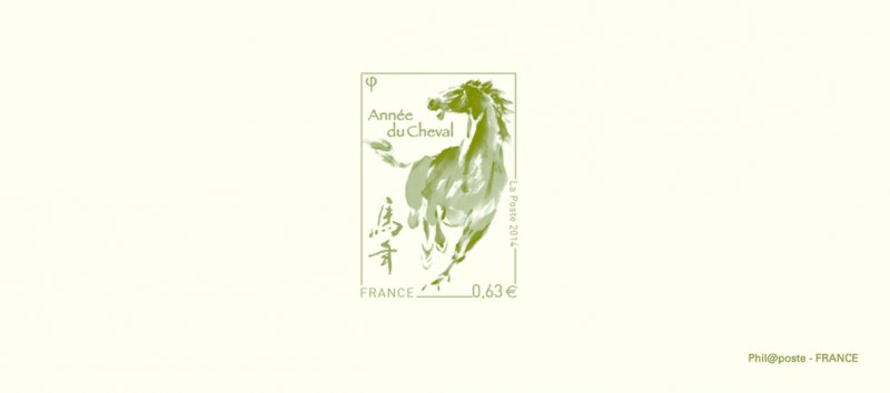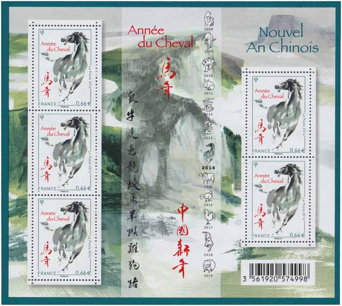| Commentaire | Bloc de 5 timbres de 0,66 € Le premier calendrier astrologique est apparu sous le règne de l’empereur Huang au 3e millénaire avant Jésus-Christ. Inscrite dans un cycle de 12 ans, chaque année du calendrier chinois est placée sous le signe d’un animal. Ce sont, dans l’ordre : le Rat, le Buffle, le Tigre, le Lapin, le Dragon, le Serpent - le Cheval - la Chèvre, Bouc ou Mouton, le Singe, le Coq ou Phénix, le Chien et le Cochon. Le 31 janvier 2014 débute l’année du Cheval. Le Cheval occupe une place très importante dans la culture chinoise. Fougueux et indépendant, travailleur et courageux, le Cheval est un symbole d’élégance et de fidélité. Il privilégie l’action, et a toujours besoin d’aller de l’avant. Considéré comme un être du bien, il représente l’esprit du fleuve jaune et incarne le peuple chinois. Yi Jing disait : « pour circuler dans le ciel rien ne vaut le dragon, sur la terre, rien n’est plus utile que le cheval ».