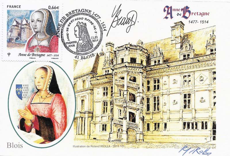 | Commentaire | Imposition : 6 bandes de 5 TP / Timbre à date “Premier Jour” conçu par Claude Perchat En savoir plus sur Wikipédia : Anne de Bretagne Née à Nantes en 1477, Anne de Bretagne est la fille aînée de François II, Duc de Bretagne, et de Marguerite de Foix. À la mort de son père, en l’absence d’héritier mâle, Anne devient duchesse de Bretagne. Pour apporter la paix et maintenir ses droits, elle épouse en 1491 le roi Charles VIII et la Bretagne est ainsi, de fait, rattachée à la France. Charles VIII meurt en 1498. Aucun des trois fils du couple n’ayant survécu, le prétendant au trône, Louis XII, échange une promesse de mariage avec Anne de Bretagne. Elle sera donc deux fois reine de France. Les clauses du contrat matrimonial lui rendent les rênes de la Bretagne, sur laquelle elle peut enfin exercer pleinement son autorité. Des enfants nés de leur union, seule la fille Claude jouera un rôle en épousant François d’Angoulême, futur François Ier. Anne de Bretagne meurt de la gravelle au château de Blois en janvier 1514, à 37 ans. Elle est inhumée dans la basilique de Saint-Denis et son coeur est déposé dans un reliquaire et rapatrié à Nantes. La Poste lui consacre un timbre, conçu par Yves Beaujard, pour commémorer le 500e anniversaire de sa mort. |