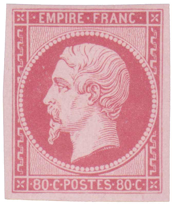 | Commentaire | Napoléon III - Empire Franc. Retrait fin 1862 Le 80 centimes rose, émis le 7 avril 1860, constitue la seconde et dernière nuance de cette valeur élevée du type Napoléon III non dentelé. Il succède directement au carmin (n°17A) dont il conserve l’usage principal : l’affranchissement des correspondances lourdes, des plis de valeur ou de certaines destinations internationales, conformément aux tarifs restructurés après la réforme du 1er juillet 1854. En novembre 1859, Anatole Hulot entreprend une série d’essais chromatiques pour améliorer la lisibilité et l’identification de cette faciale élevée. Plusieurs nuances sont soumises au Directeur général des Postes, qui arrête son choix sur un rose franc, mieux différencié des autres valeurs de la série. Cette sélection marque l’une des rares interventions officielles sur la palette impériale avant l’adoption de la dentelure en 1862. Le dessin reste celui du type Empire non dentelé : profil gauche de Napoléon III, légende « EMPIRE FRANC », et médaillon orné issu du poinçon conçu par Jacques-Jean Barre. Le timbre est imprimé en typographie, en feuilles non dentelées, selon les procédés standards des ateliers de la Monnaie de Paris dirigés par Hulot. Comme sur les autres valeurs de cette période, les oblitérations courantes sont le losange Petits Chiffres pour les bureaux de province et l’étoile muette pour le bureau central de Paris. Le n°17B est aujourd’hui recherché pour son nuancier très caractéristique, ses tirages plus réduits que les émissions antérieures et son rôle de transition juste avant les grandes réformes techniques de 1862.