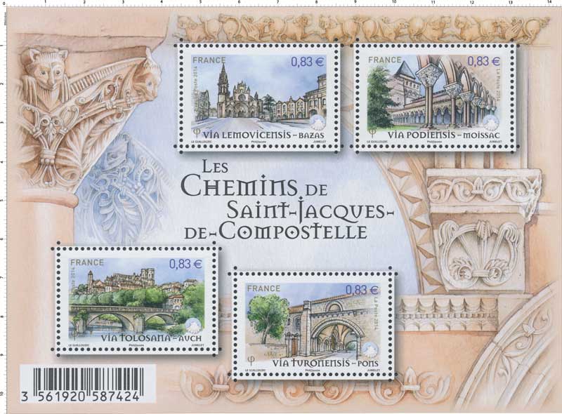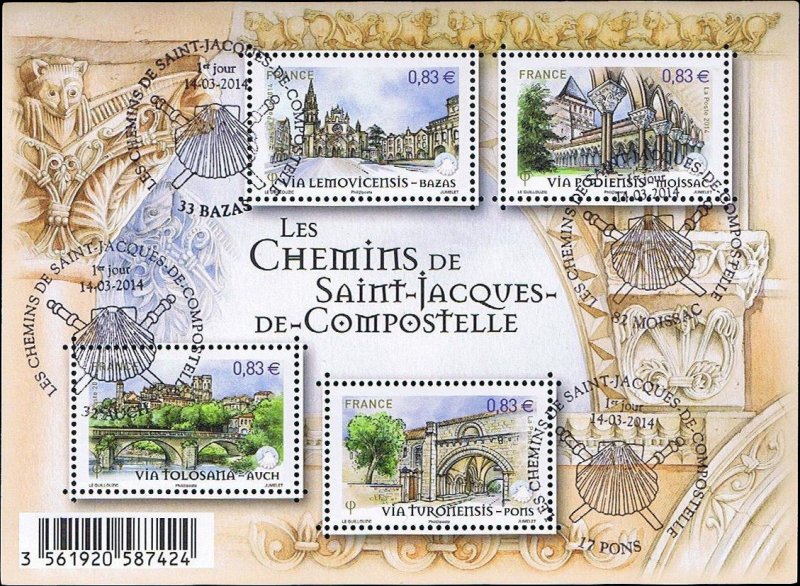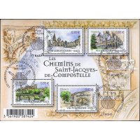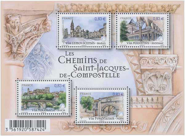 | Description | Bloc de 4 timbres illustrant des chemins célèbres : via Podensis, via Turonensis, via Lemovicensis et via Tolosana |