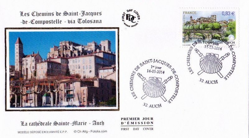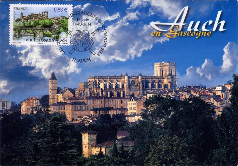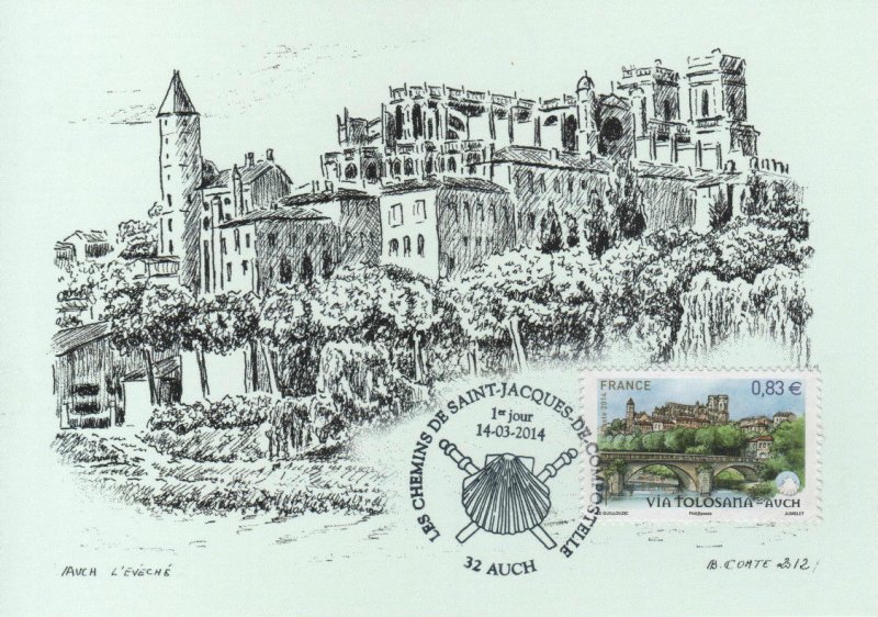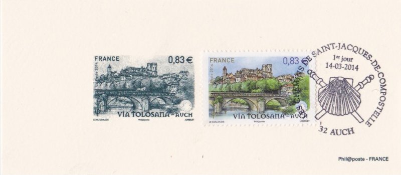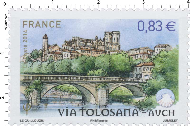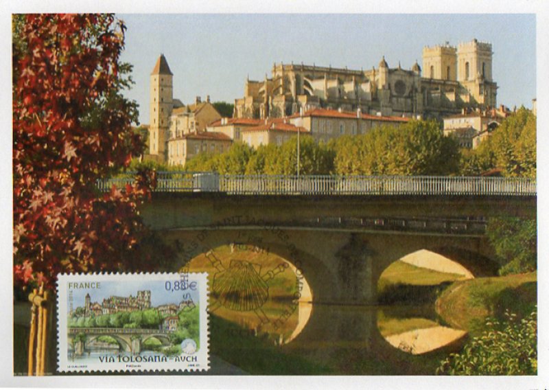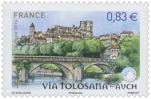 | Commentaire | Timbre à date “Premier Jour” conçu par I. Ochoa Troisième et avant dernier volet de la série annuelle "Les chemins de Saint-Jacques-de–Compostelle" En savoir plus sur Wikipédia : Via Tolosane |