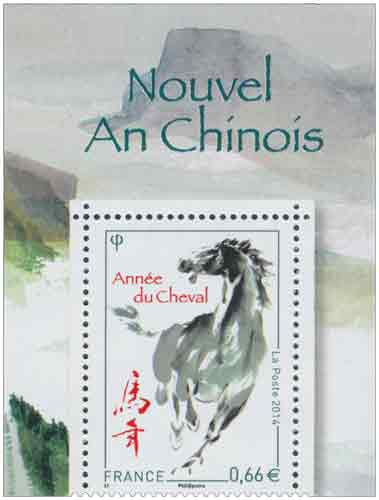 | Commentaire | Issue du bloc de 5 timbres de 0,66 € Le premier calendrier astrologique est apparu sous le règne de l’empereur Huang au 3e millénaire avant Jésus-Christ. Inscrite dans un cycle de 12 ans, chaque année du calendrier chinois est placée sous le signe d’un animal. Ce sont, dans l’ordre : le Rat, le Buffle, le Tigre, le Lapin, le Dragon, le Serpent - le Cheval - la Chèvre, Bouc ou Mouton, le Singe, le Coq ou Phénix, le Chien et le Cochon. Le 31 janvier 2014 débute l’année du Cheval. Le Cheval occupe une place très importante dans la culture chinoise. Fougueux et indépendant, travailleur et courageux, le Cheval est un symbole d’élégance et de fidélité. Il privilégie l’action, et a toujours besoin d’aller de l’avant. Considéré comme un être du bien, il représente l’esprit du fleuve jaune et incarne le peuple chinois. Yi Jing disait : « pour circuler dans le ciel rien ne vaut le dragon, sur la terre, rien n’est plus utile que le cheval ».